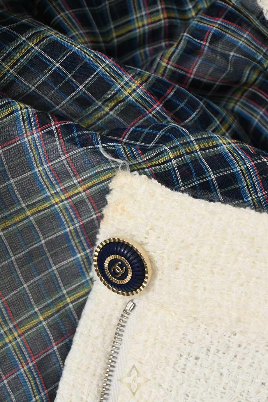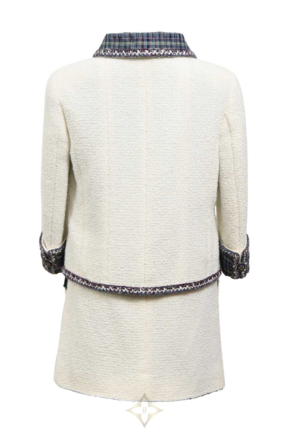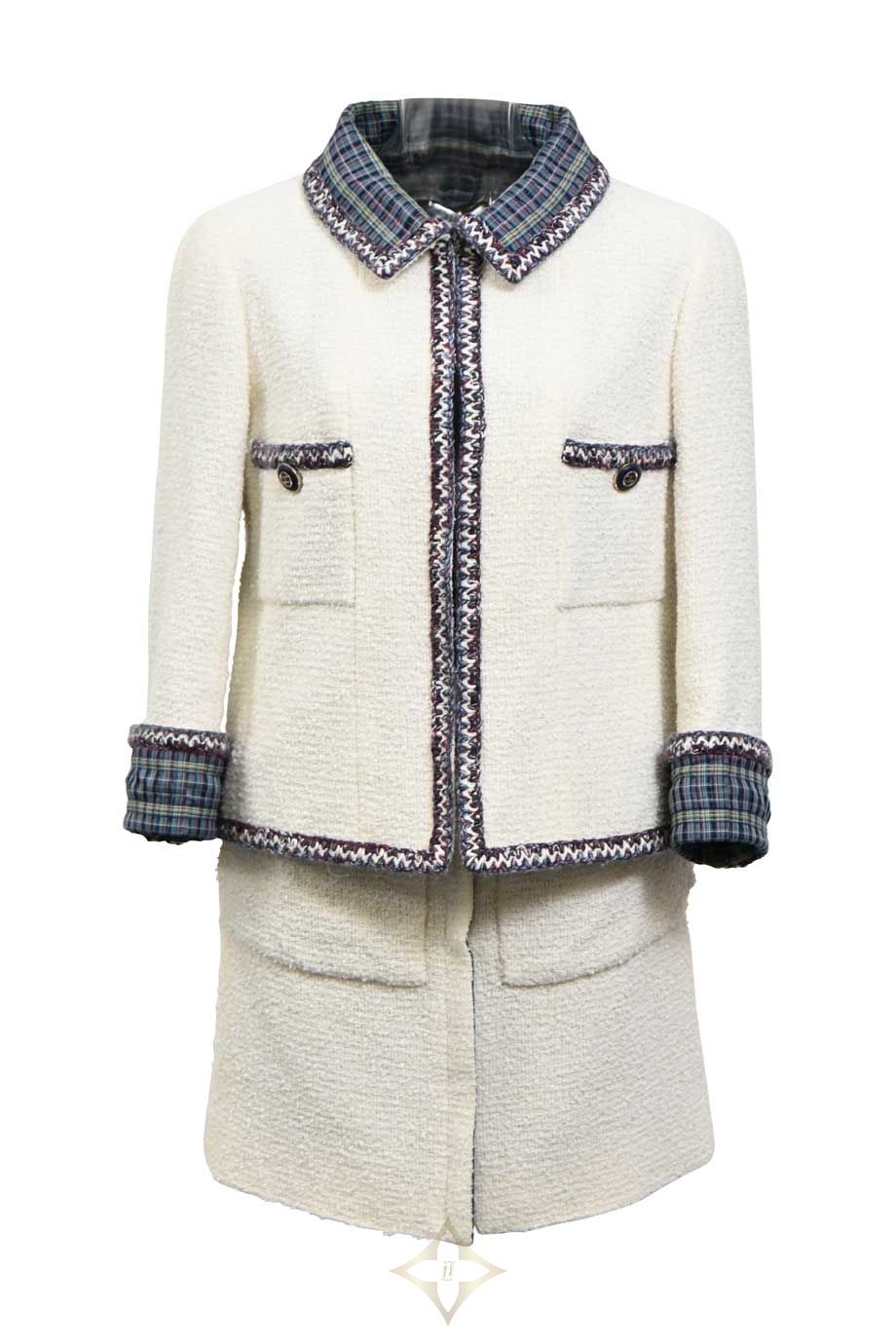Chanel White cotton-blend bouclé tweed two-piece skirt suit featuring plaid-lined portrait collar contrast-trimmed jacket and high-waisted mini skirt PRICE: HK$45,000.00 Size: FR34 Condition: Worn Learn More Colour: White | Multi Product Code: WW48079 Product Details Cruise 2020 Look 70 Brand Ref. No: P62693V45445 Front zip fastening. Stained and snagged jacket with loose button. Stained skirt. Materials: Synthetic | Cotton Season | Year: Cruise 2020 ——— HULA Boutique Shop C, Ground Floor 56-58 Hollywood Rd, Central, Hong Kong Email: hello@thehula.com Tel: +852 2544 1200 WhatsApp: +852 6290 2106