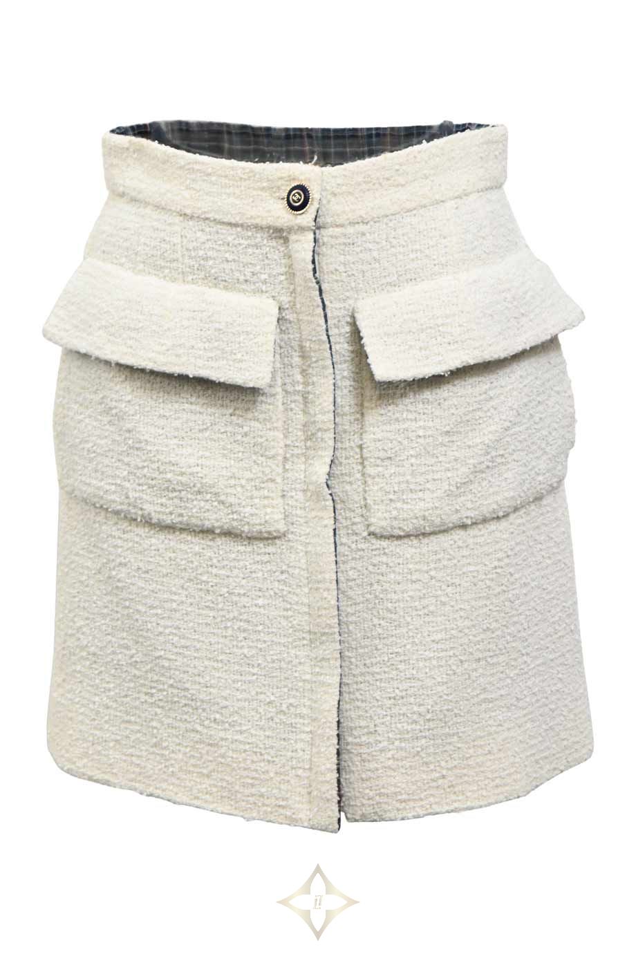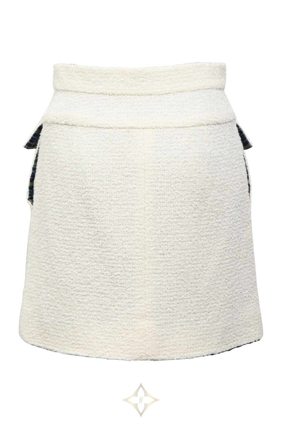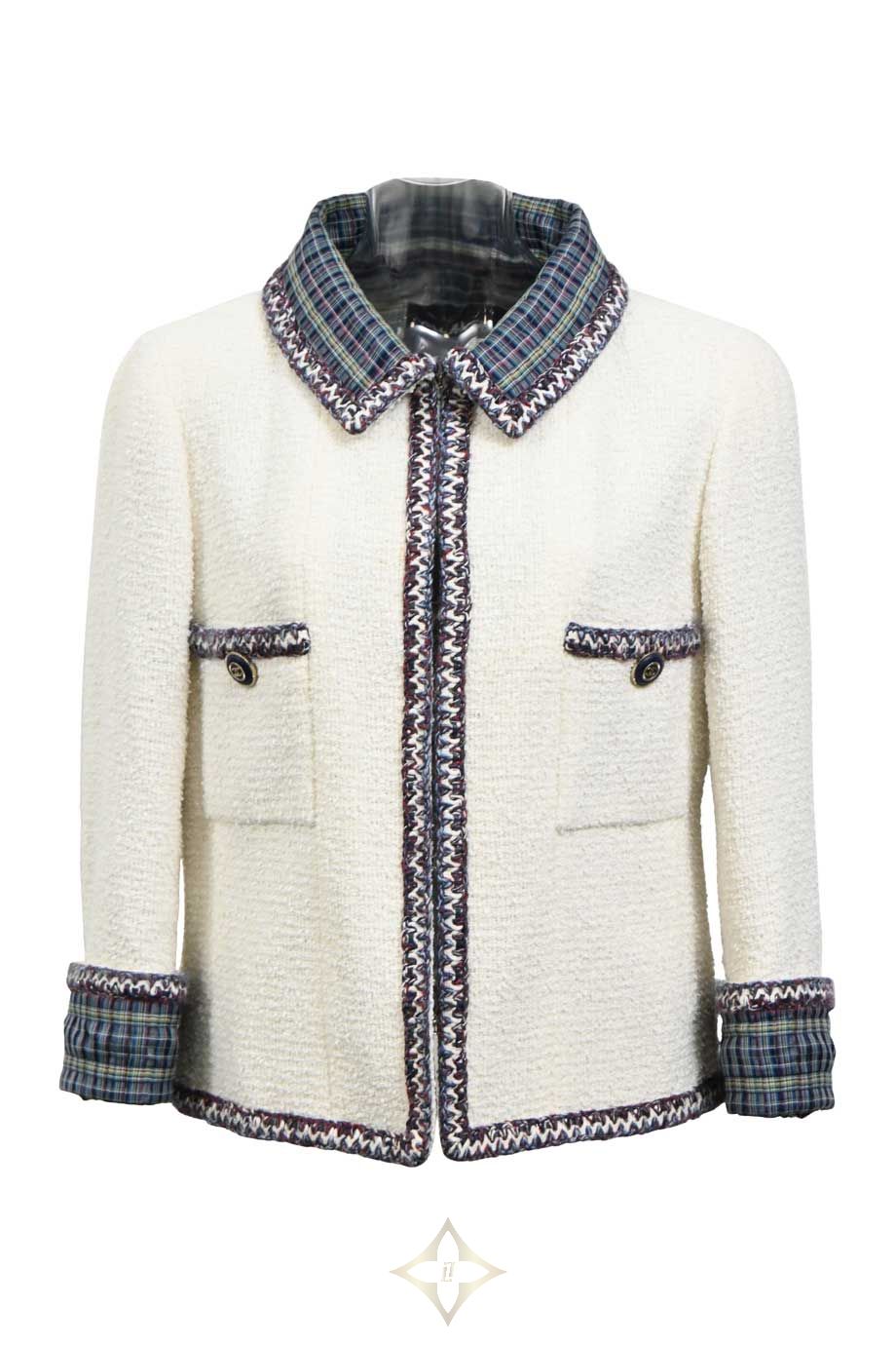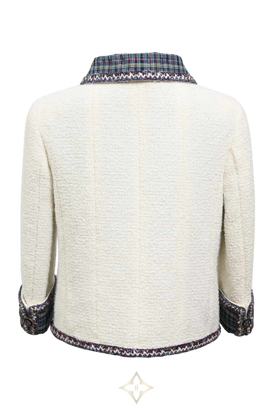 Chanel White cotton-blend bouclé tweed two-piece skirt suit featuring plaid-lined portrait collar contrast-trimmed jacket and high-waisted mini skirt PRICE: HK$45,000.00 Size: FR34 Condition: Worn Learn More Colour: White | Multi Product Code: WW48079 Product Details Cruise 2020 Look 70 Brand Ref. No: P62693V45445 Front zip fastening. Stained and snagged jacket with loose button. Stained skirt. Materials: Synthetic | Cotton Season | Year: Cruise 2020 ——— HULA Boutique Shop C, Ground Floor 56-58 Hollywood Rd, Central, Hong Kong Email: hello@thehula.com Tel: +852 2544 1200 WhatsApp: +852 6290 2106