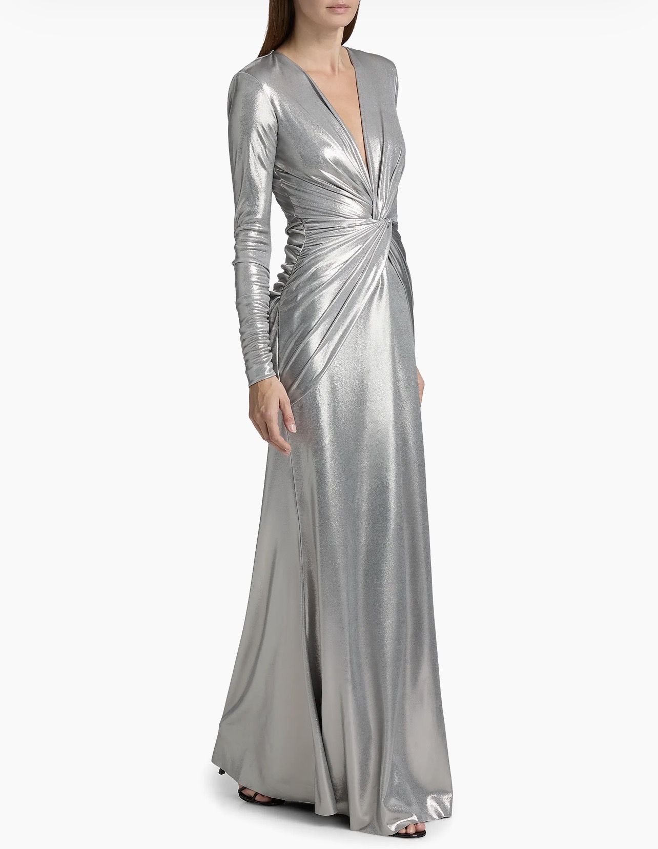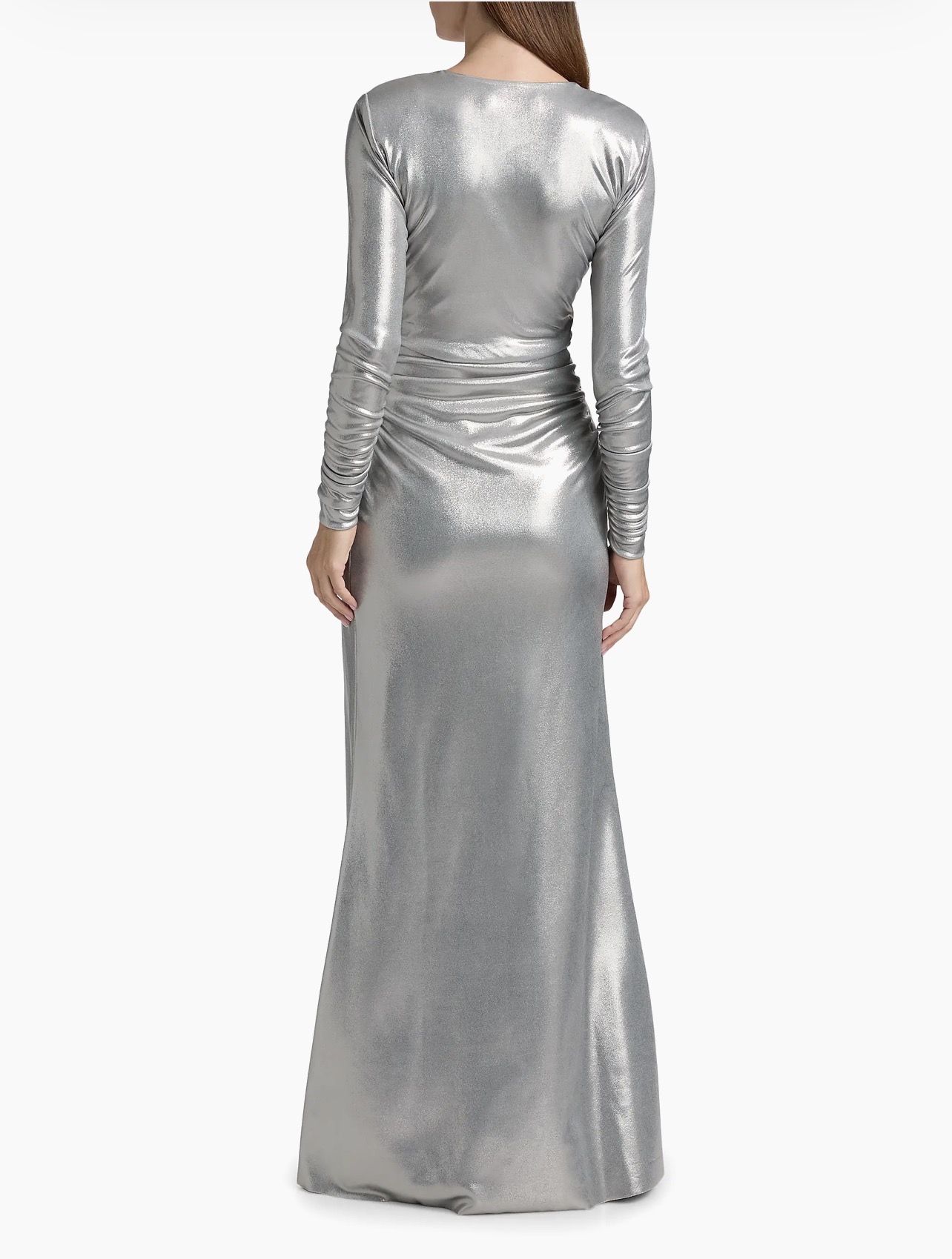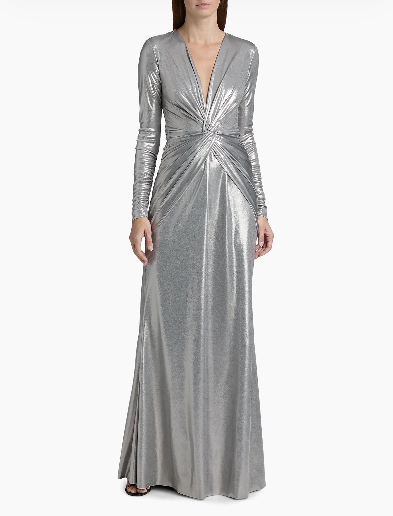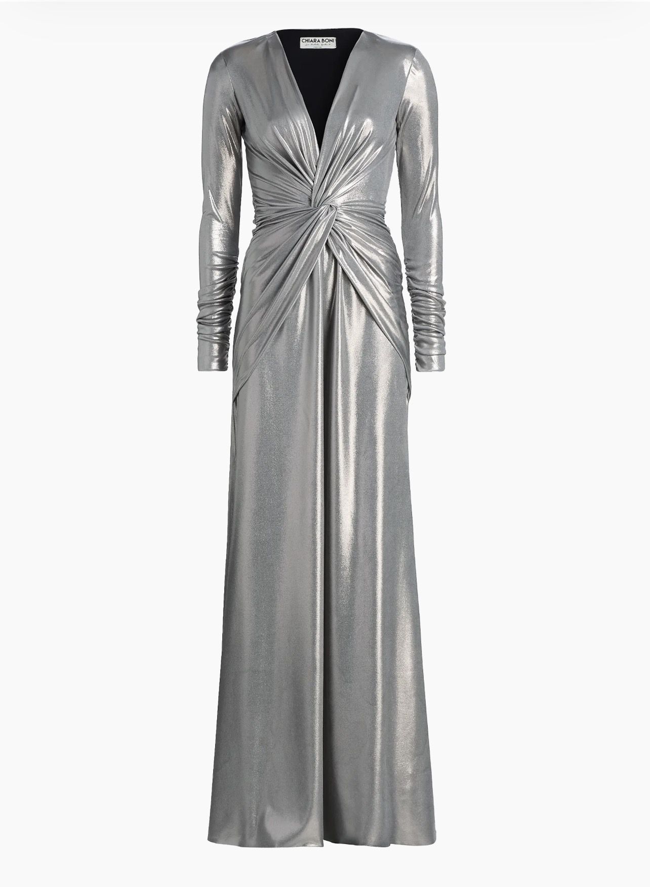 Cut in a fitted column silhouette, this Hajarix Splendid long-sleeve gown from Chiara Boni La Petite Robe features a metallic finish, plunging V-neckline, and twist-front detail.