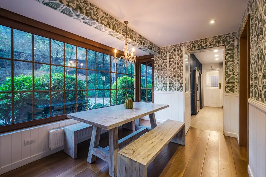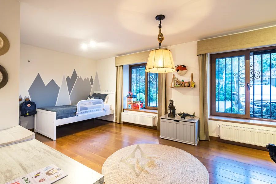 Garden level, large family room and games room with separate study space, two bedrooms, bathroom with dressing room, and access to the pool.