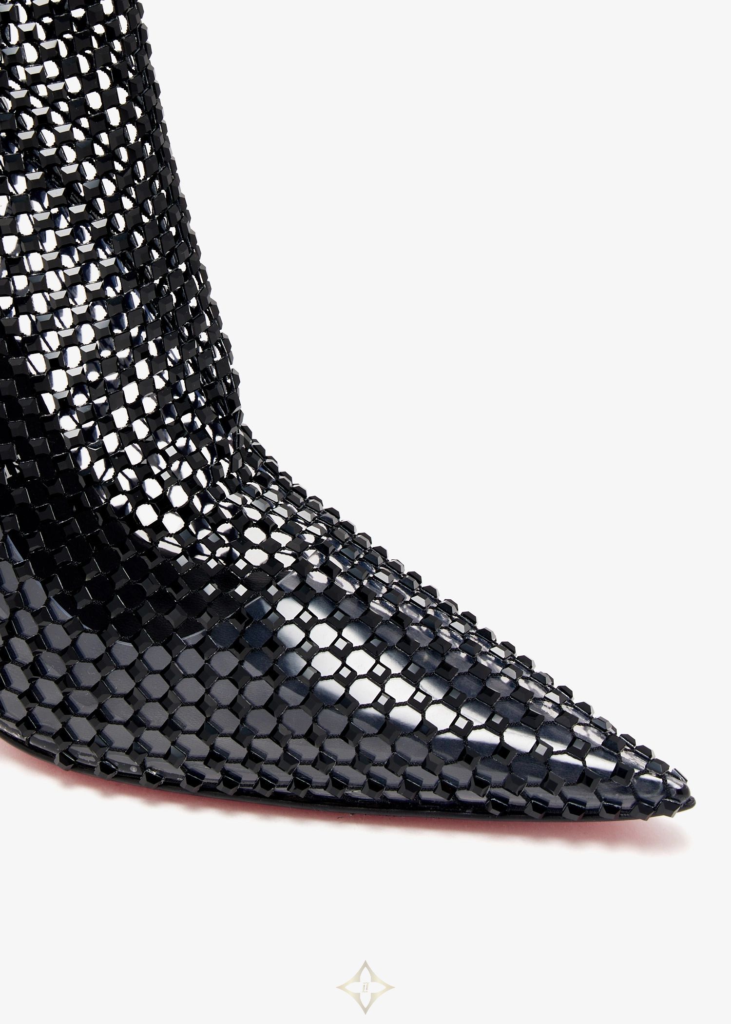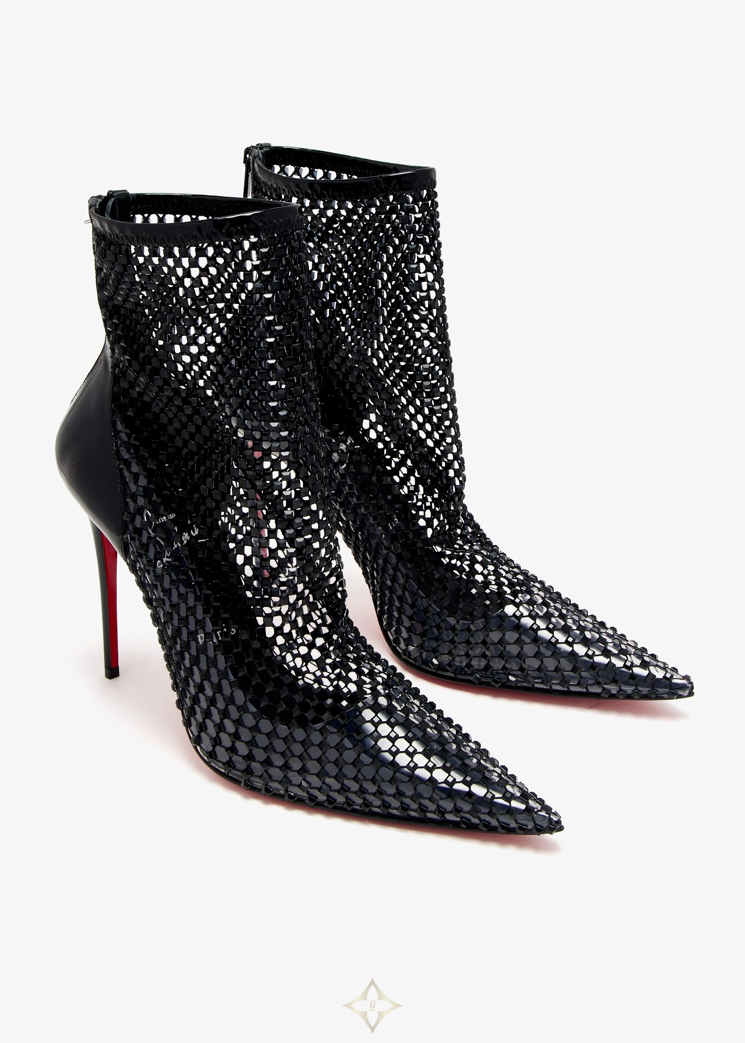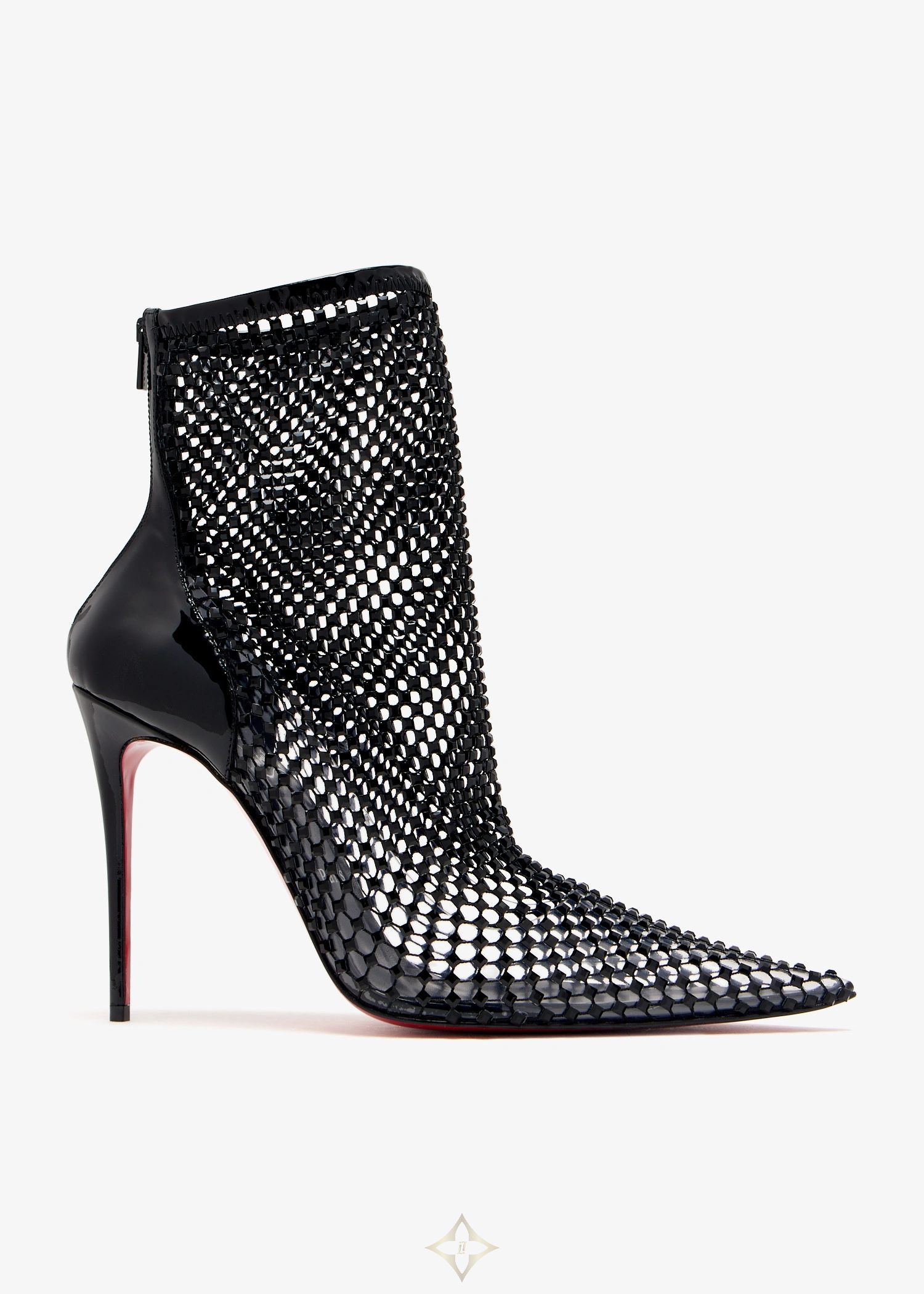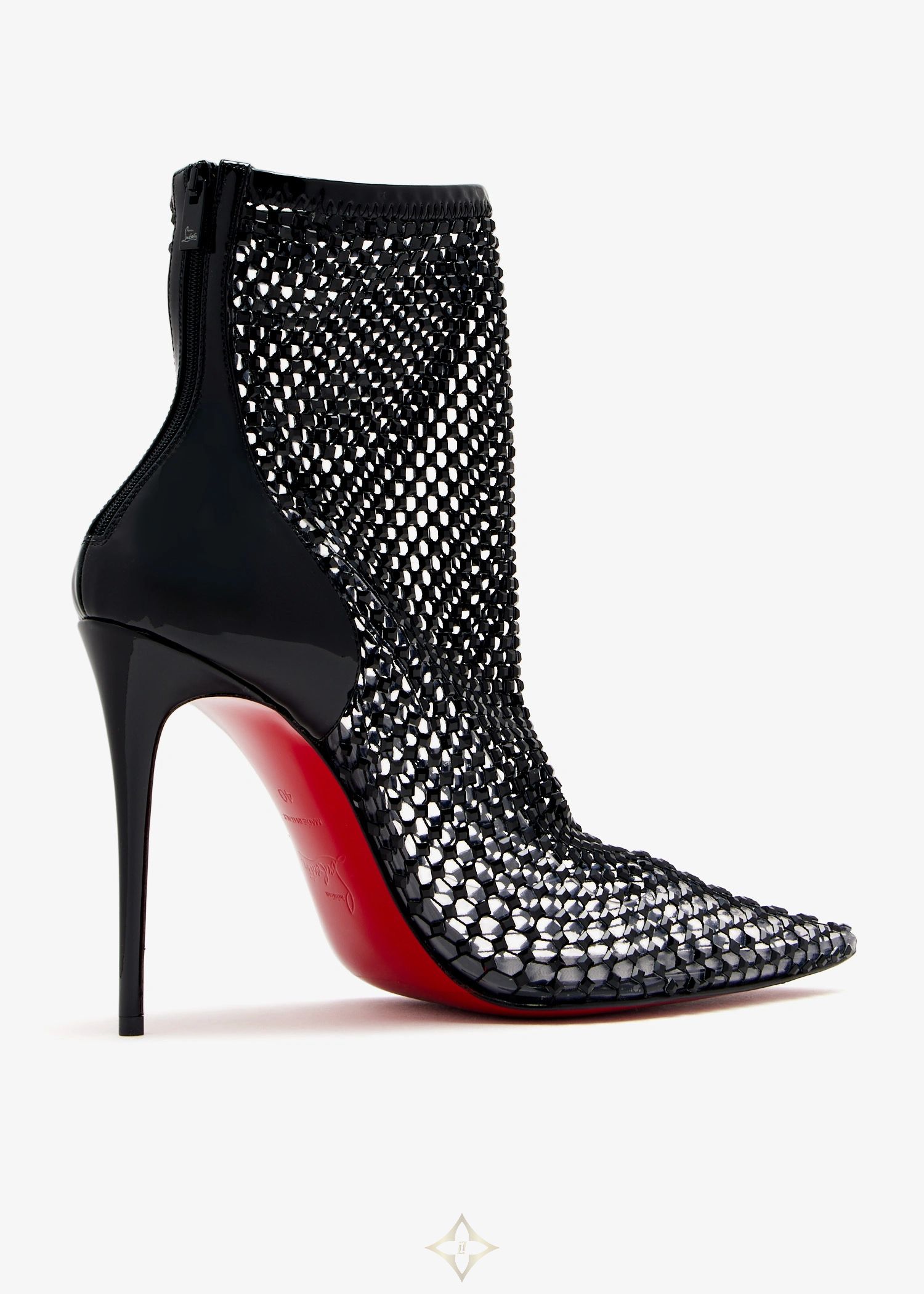 A sharp pointed toe, shiny mesh construction, and curved lines make these streamlined ankle boots a dramatic, modern standout. Christian Louboutin's Kate Max Booty boots arrive in black fishnet embellished with square strass and patent calf leather, with a pin-thin 100mm stiletto heel, and the signature, striking red sole.