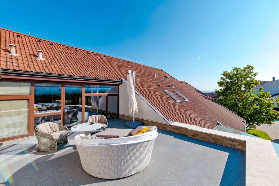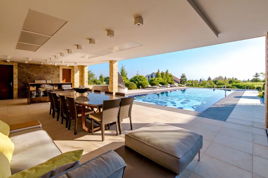 The grounds are designed for both relaxation and entertaining on a grand scale. At its heart lies a striking 16-meter swimming pool, accompanied by a state-of-the-art barbecue pavilion and a dining table for sixteen, perfect for summer gatherings. Just steps away, a high-end American jacuzzi provides year-round indulgence. The property’s location, within a peaceful and quiet village, lies only four kilometers from Hévíz, home to Europe’s largest natural thermal lake, where outdoor bathing is possible throughout the year.