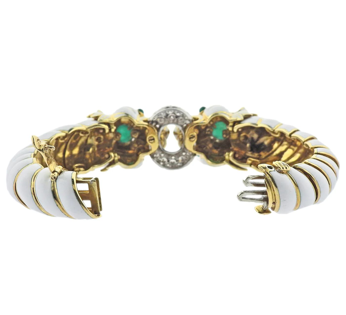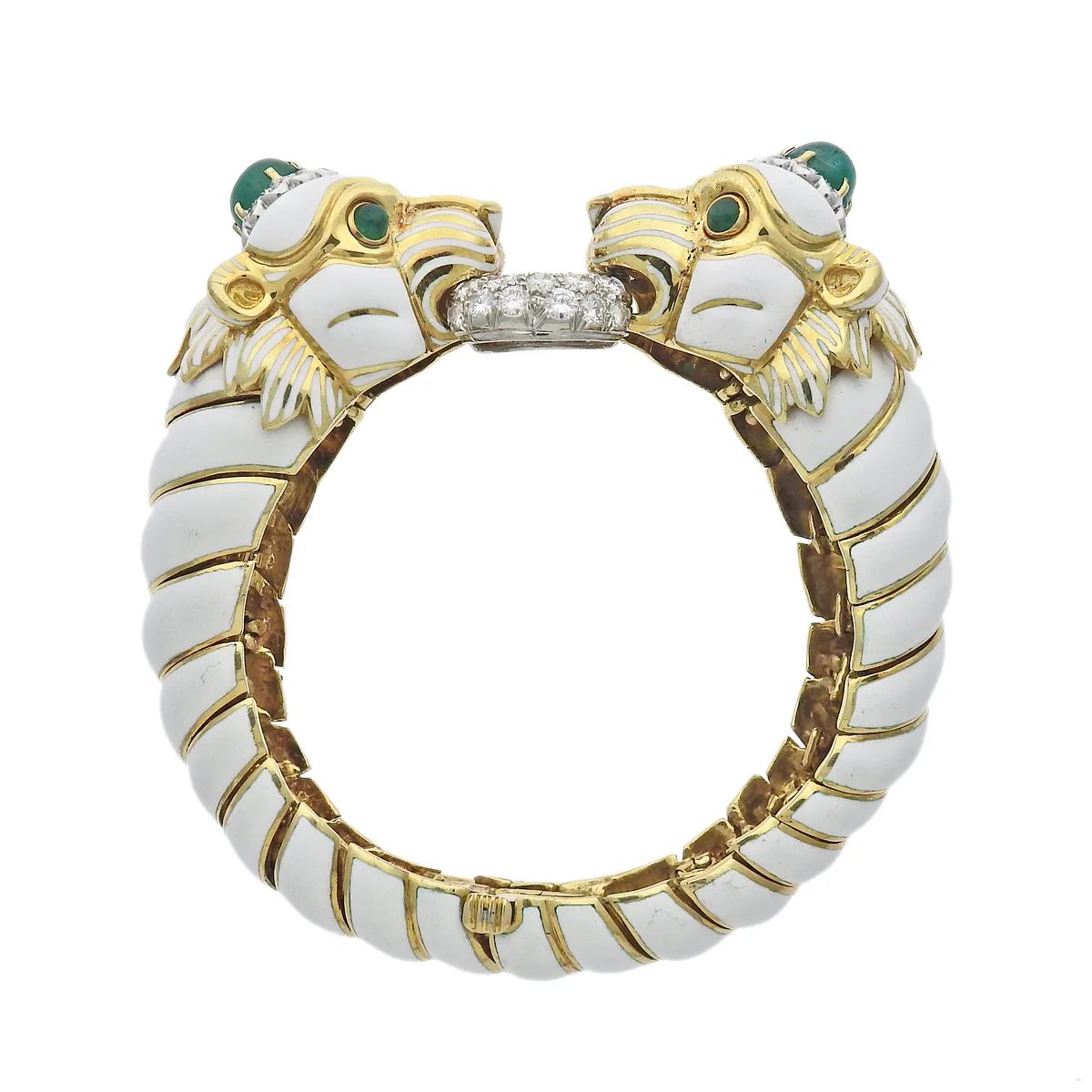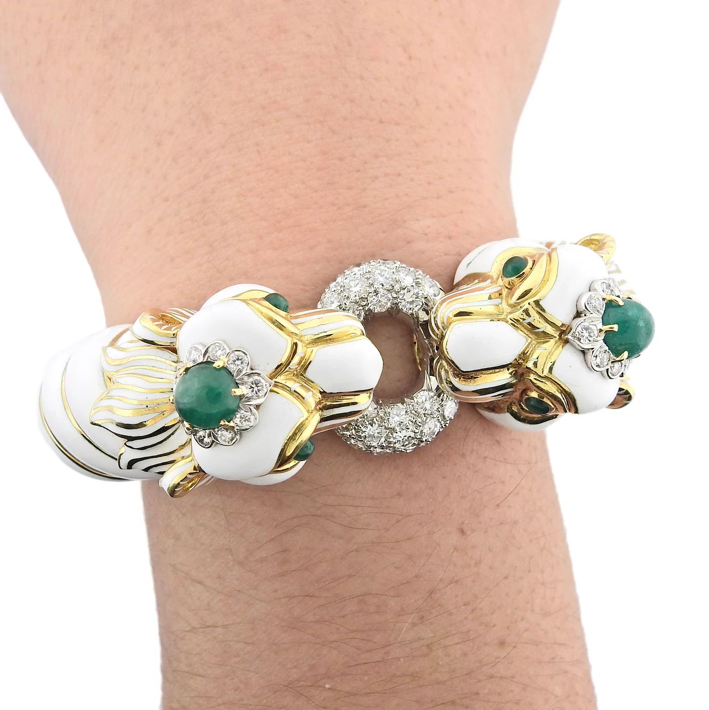 DAVID WEBB DIAMOND GOLD PLATINUM EMERALD ENAMEL TWIN LION BRACELET