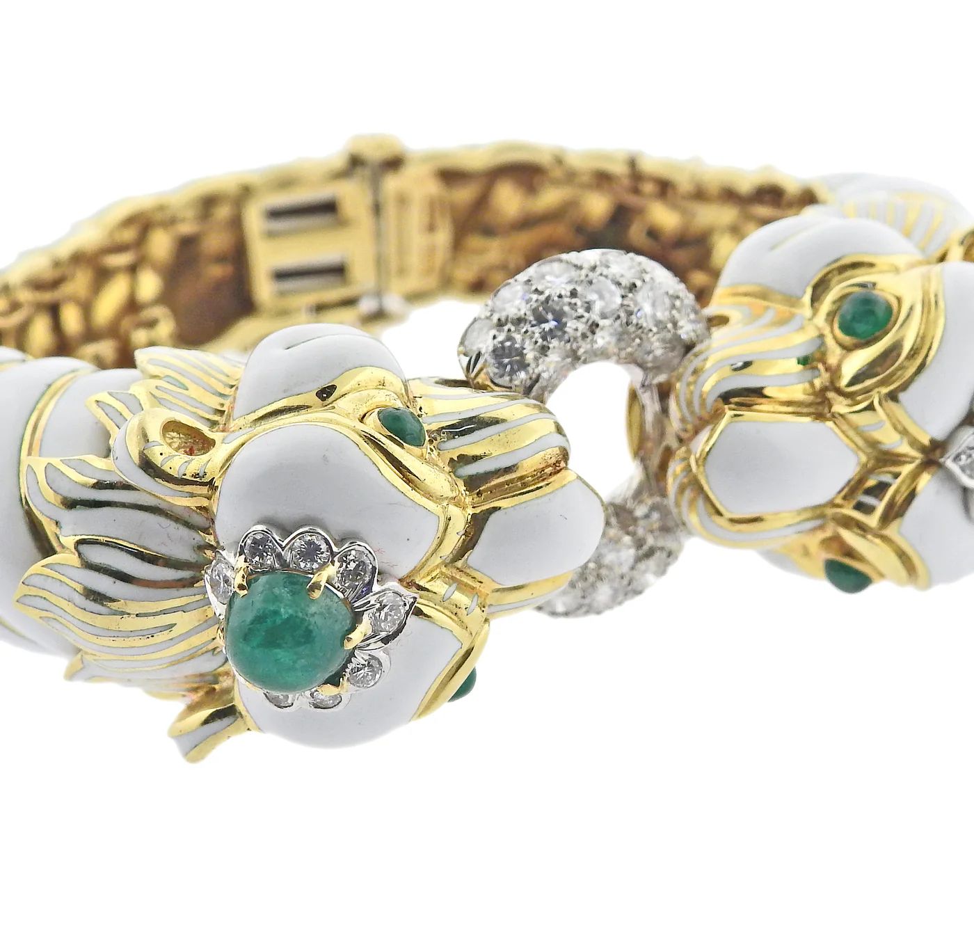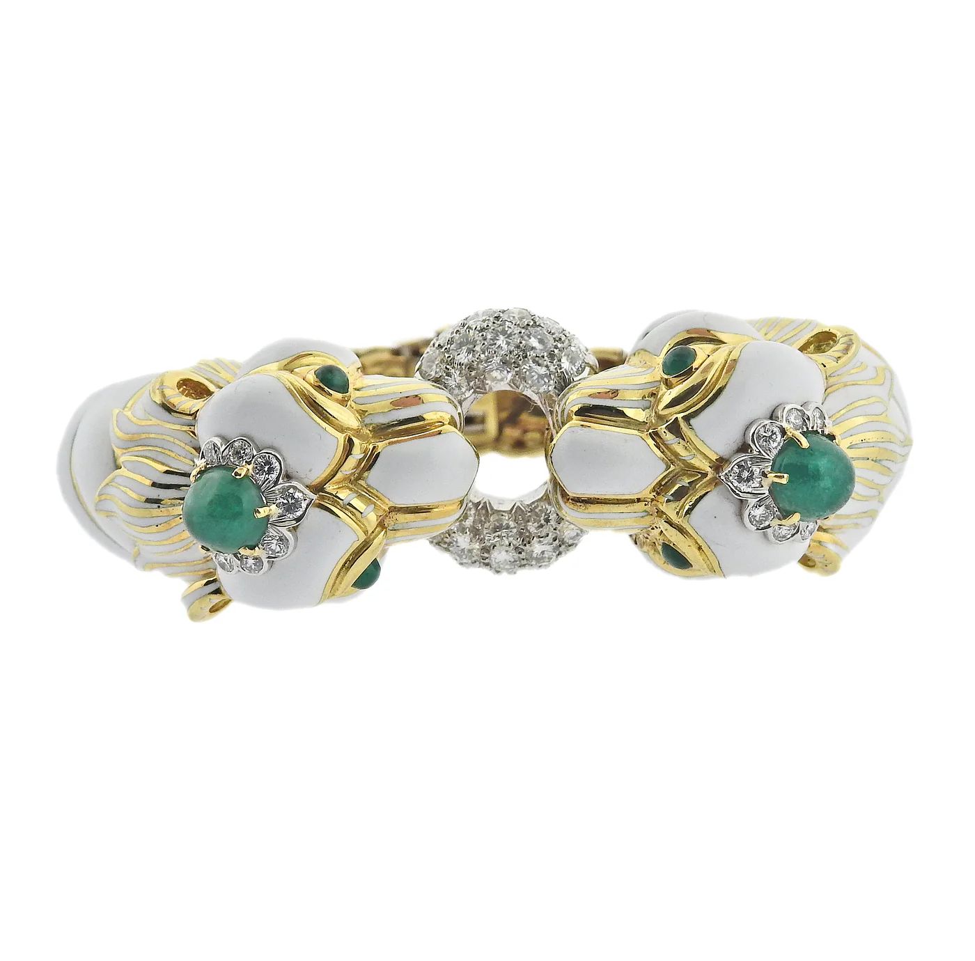 Impressive 18k gold and platinum twin lion bracelet by David Webb, with emerald cabochons and approx. 2.00cts in H/VS diamonds. Enamel has some minor damage on the crease, between links.