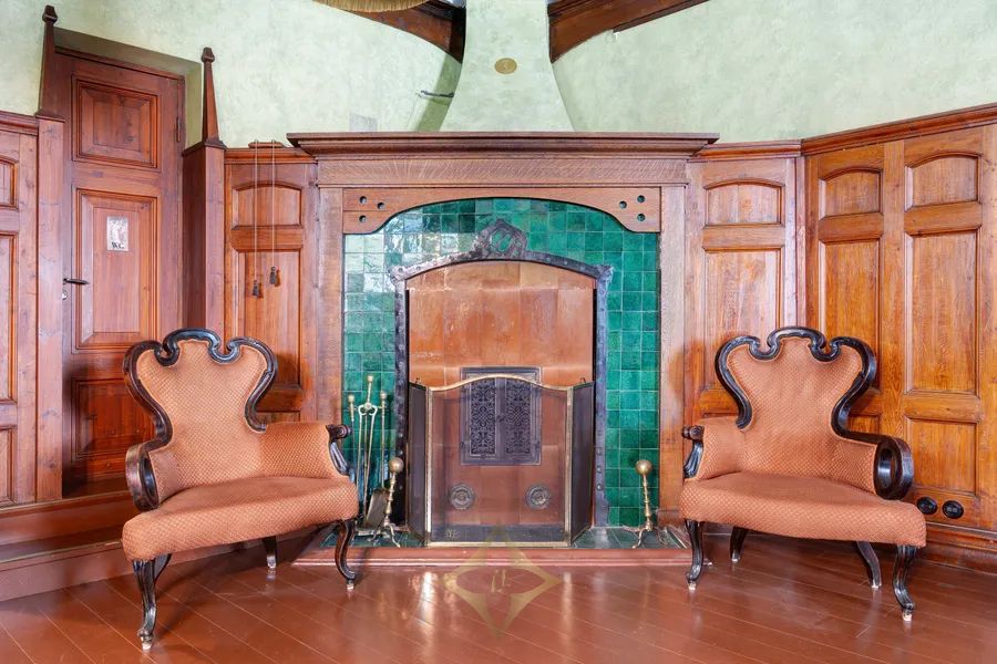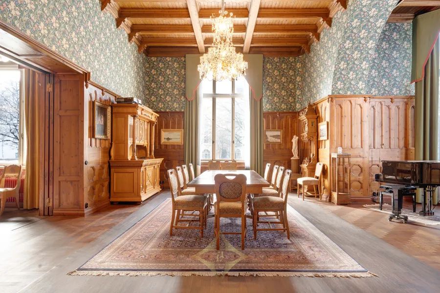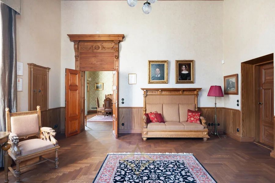 The interior, which exudes luxury and dignity, makes any visitor smile when looking at all the beauty that can be found in the building; as a representative space, the solemn high main hall of the excellently functioning middle floor and glowing brilliance of the crystal chandeliers, the grand piano hall representing the atmosphere of a medieval knight’s castle and its coffered ceiling panels, as well as wooden and decorated door frames, curtains with rods designed by the architect and wonderful wallpapers that exude the spirit of the building’s era.