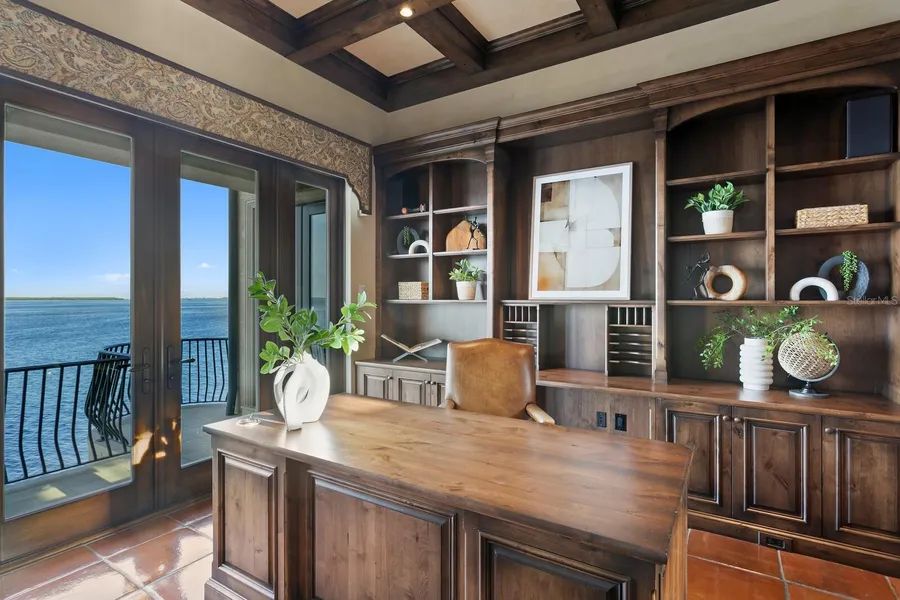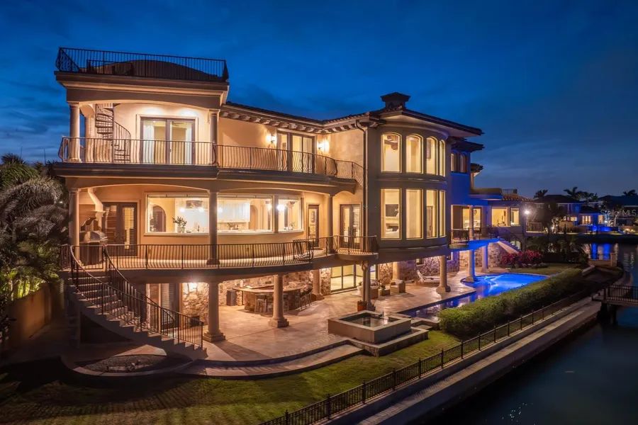 An extraordinary waterfront estate at the tip of the peninsula, this iconic Mediterranean residence commands nearly 200 feet of direct open-water frontage in Tierra Verde’s coveted Sands Point community. Known as the ”Magic Mike House” for its on-screen cameo in the film, the property offers sweeping views of the bay and the dramatic silhouette of the Sunshine Skyway Bridge. Behind private gates, this walled compound features a rare separate guest casita. Showcasing timeless sophistication, meticulous craftsmanship, and rare amenities--including two elevators--this residence blends refined architectural details with expansive entertaining spaces to deliver coastal luxury reimagined for modern living. Step into the dramatic great room featuring soaring two-story ceilings, Saltillo-tile flooring, breathtaking views, and a striking limestone fireplace that flows seamlessly to dining and lounge areas with an impressive concave window offering panoramic bay vistas. The expansive living level includes dual offices or flex space, a primary-suite wing with a stunning custom dual closet and dressing area, an indulgent bath with a walk-in shower, and a private waterfront terrace. A well-appointed media room with surround sound, wet bar, and beverage station complements the main level. Private spaces on the upper level include a grand guest quarter (casita) with a separate elevator, two en-suite guest bedrooms, a living room, dining space, a secondary bar and lounge, and a second laundry--providing exemplary accommodations for extended family or guests. There is an additional bonus room on the upper level, along with two additional guest bedrooms, each with access to the waterfront terrace and rooftop for 360-degree vistas. Outdoors, experience private resort-level allure with a heated saltwater pool and spa, accessible via dual staircases. The ground-level wet bar and covered lanai offer exceptional poolside dining and entertaining areas. Engage with abundant marine life while preparing for a glorious day on the open water from a full-service dock. Additional appointments include impact-rated doors and windows, dual elevators, an Elan Smart Home System, automated window treatments, a whole-home generator, Lutron lighting, a water-purification system, a 5+ car garage, a portico, and exterior video security. Close to the country’s top-rated beaches, Tierra Verde Marina, Shell Key, and 15 minutes to Downtown St. Petersburg, with the very best of the area’s sports venues, shopping, dining, and recreation mere minutes away. Boasting easy access to the Gulf in this revered coastal location, the ultimate Florida waterfront lifestyle awaits.