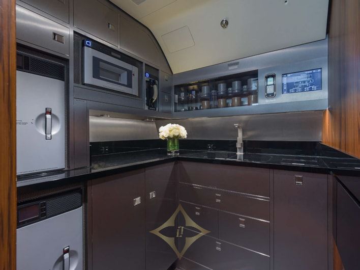 Zone 3: The aft lounge is located directly adjacent to the forward lounge, and no pass-through access is required. Aft lounge consists of a 5-place “L” shaped divan and a single seat situated on the left surrounding two Hi-Lo tables, opposite retractable 50” ultra-high definition monitor and two single seats.