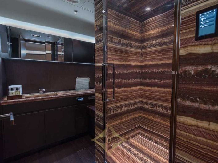 Zone 4: Aft again is the Guest Suite with queen bed, large closet, bench seat with storage beneath and 43” ultra-high definition monitor. Bathroom with full size shower is directly accessible.