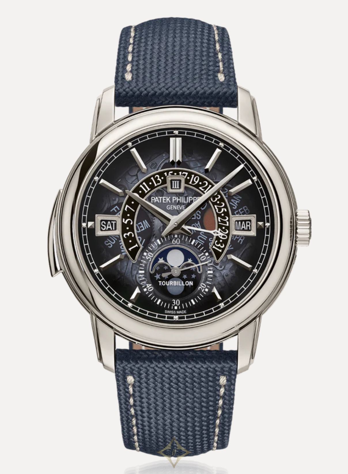 The original face of this new model is enhanced by a navy blue embossed calfskin strap with a fabric pattern, contrasting cream-colored stitching and a platinum fold-over clasp.