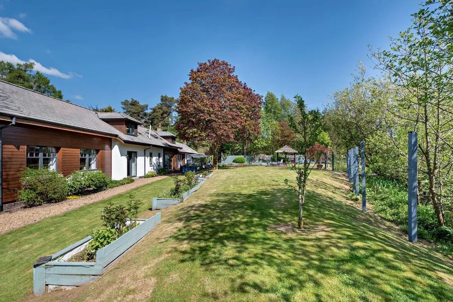 Featuring quality fixtures and fittings, generously proportioned rooms, and with all six of its bedrooms benefitting from their own luxurious en-suite. The underfloor heating sits beneath a wealth of beautiful hardwood flooring on the ground floor, seamlessly combining style and functionality. The accommodation flows from a welcoming part double-height reception hall with useful storage, cloakroom, patio doors to the garden and galleried landing. It comprises a vaulted cathedral ceilinged formal lounge with fireplace, full-height and picture glazing, patio doors to the garden, and two high placement windows adding architectural grandeur and flooding the room with natural light. A expansive dining room also provides patio doors to the rear terrace. The kitchen/breakfast room opens into a vaulted sitting room with feature fireplace, a large sky lantern and its own access to the rear terrace. It provides a range of wall and base units including a large central island with breakfast bar, allowing for ample space to entertain and socialise with its modern integrated appliances, space for a sizeable table, patio doors to the rear terrace and a neighbouring fitted utility room with Belfast sink. This area of open layout allows families to interact while cooking, eating, and relaxing, fostering a connected atmosphere.