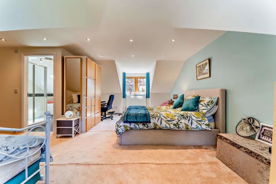 The ground floor accommodation is completed by a principle bedroom wing, featuring a double-height vaulted bedroom with patio doors to the garden, a large fitted dressing room, and an elegant bathroom with Porcelanosa fittings including a roll-top bath, shower and twin sinks. There are also two further double bedrooms, one currently configured as a study and the other with patio doors to the garden. Both share Jack and Jill access to an en suite shower room.