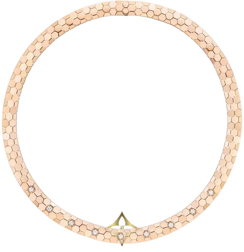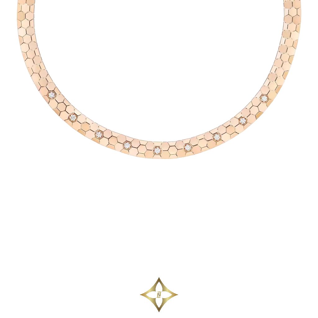 Highly sophisticated, the necklace Bee De Chaumet turns out to be a worn second skin, given its flexibility. Perfectly resembling the shape of the honeycomb, each Bee De Chaumet diamond is maintained by a six-grain set. To highlight their sheen, the diamonds are slightly raised, almost making the metal disappear. Featuring a discreet closure, the creation sensually marries the curves of the silhouette.