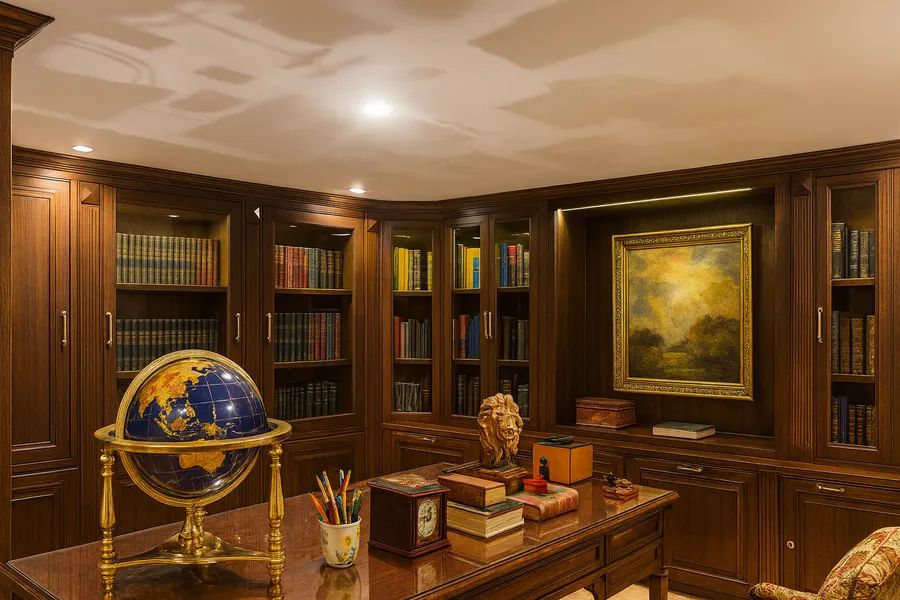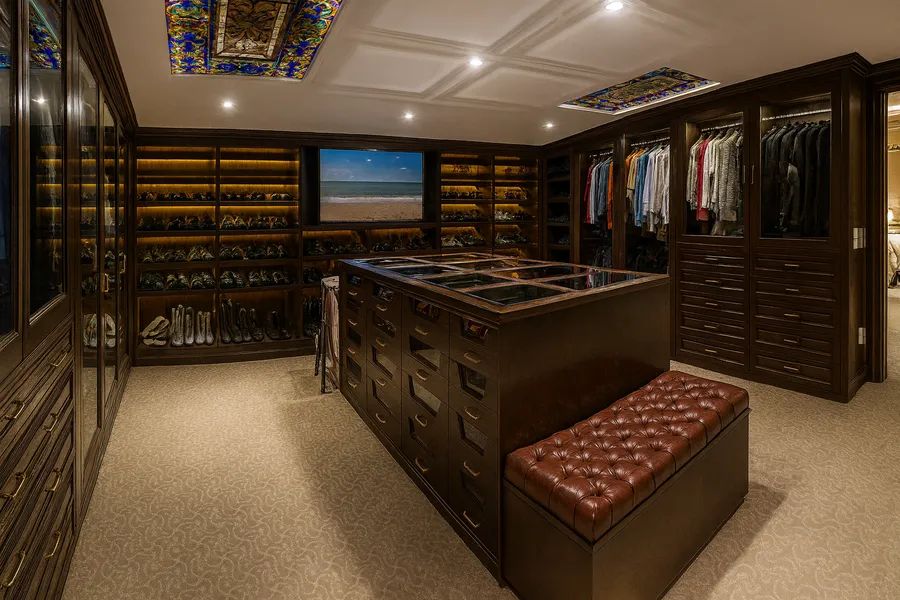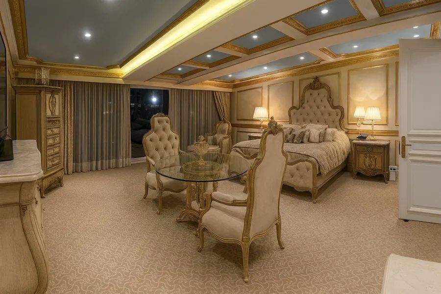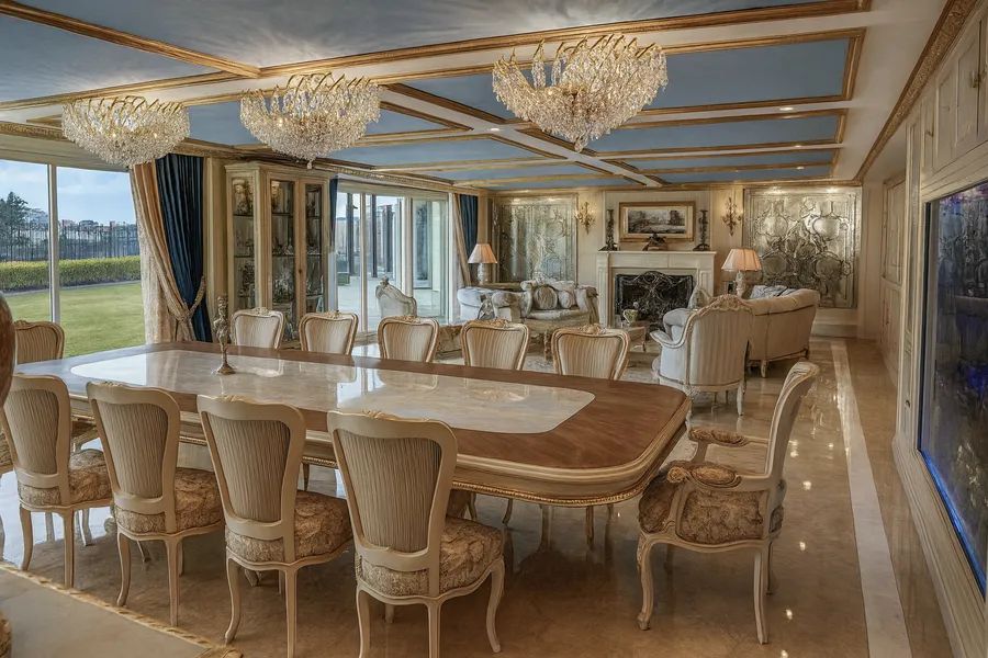 The home is fully furnished with imported pieces from Russia, France, England, and the United States, complemented by spectacular designer stained-glass ceilings and murals, hand-carved marble finishes, and gold-leaf details throughout. Several artworks, chandeliers, and antique furniture pieces are included in the sale.