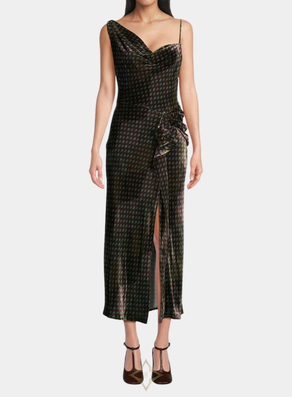 The Deyon midi-dress fuses bold print play with elegant drape. It features a softly cowl-neckline and an asymmetric silhouette that flows into a subtle front slit, inviting movement and light. The lightweight viscose fabric is patterned in a collage of abstract animal spots and polka-dots, capturing the brand’s eclectic visual language..