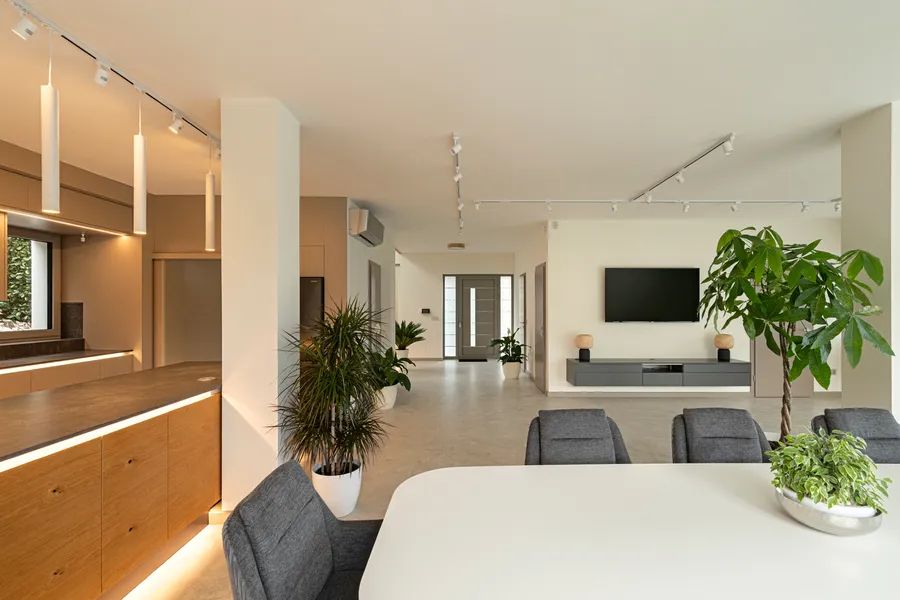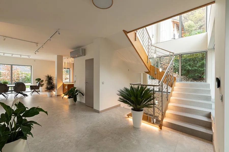 Sustainability and efficiency are integral to the villa’s concept. High-performance insulation, triple-glazed aluminum windows, heat-pump assisted ceiling and floor heating, supplemental climate control on every level, and a heat-recovery ventilation system work together to create an energy-efficient and healthy living environment. The property holds an A+ energy rating and complies with all current technical and safety certifications.