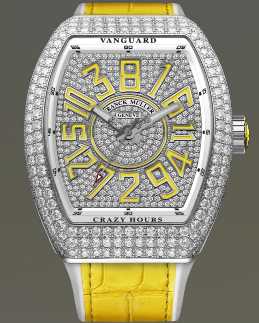 Franck Muller Vanguard Crazy Hours 44 x 53.7 mm V 45 CH D CD (JA) OG DM YL PRICE: £52,466 Product Description Franck Muller Vanguard Crazy Hours 44 x 53.7 mm watch. Model reference: V 45 CH D CD (JA) AC DM YL. Stainless steel case set with diamonds. Diamonds dial. Automatic movement. Yellow alligator leather strap with white edge. Swiss made. The watch comes in the original packaging, with a set of documents and 2 years warranty. At Watches of Mayfair we offer new authentic watches at the best prices. Brand: Franck Muller Reference: V 45 CH D CD (JA) AC DM YL Delivery Option/Shipment: Usually ships in 2-3 weeks Condition: New (Original Box & Papers) Warranty: 2 years Country of Manufacture: Switzerland Case material: Gemstones, Steel Case diameter (mm) : 44 x 53.7 mm Case Shape: Tonneau Thickness (mm): 13.7 mm Waterproof: 30 meters / 3 ATM Dial: Diamonds dial Movement: Automatic Movement Calibre: MVD FM 2800-CHRS Power Reserve (h): approx. 42 hours when fully wound No of Jewels: 19 jewels ——— Watches of Mayfair Ltd London Concept Boutique BOUTIQUE ADDRESS 13 Shepherd Market, Mayfair, London, W1J 7PQ, UK Phone: +44 20 7629 5055 WhatsApp: +44 7917 880801 EMAIL: sales@watchesofmayfair.com