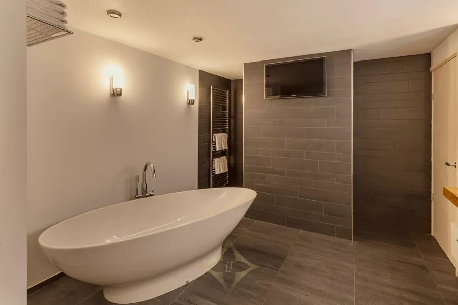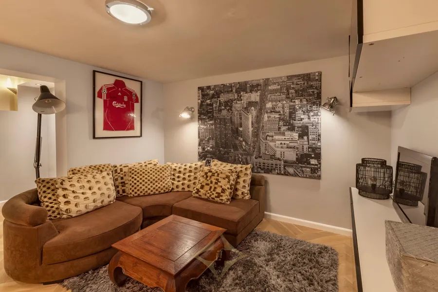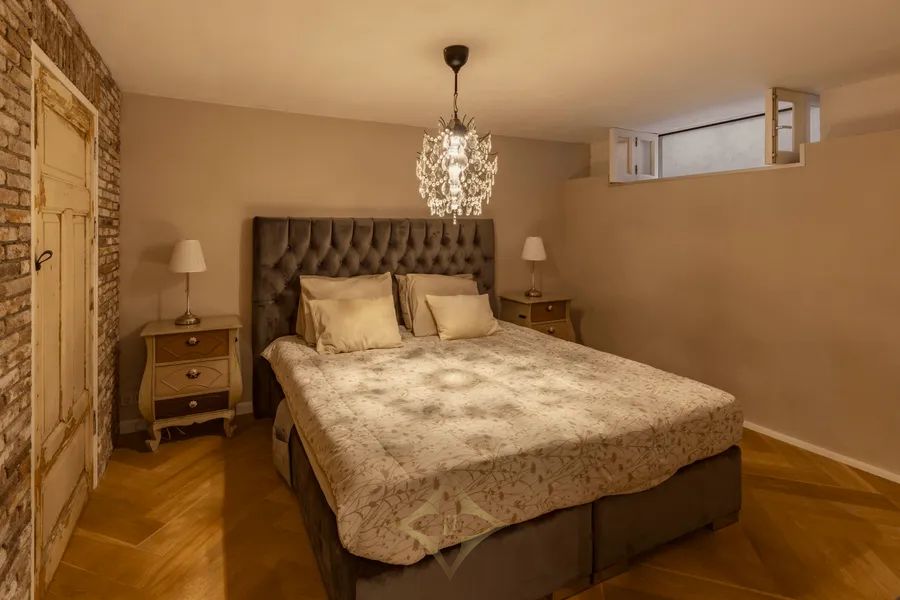 The souterrain comprises a spacious multifunctional bedroom, currently arranged as a study and lounge, which provides access to the main bedroom. The bedroom is practically designed with a walk-in area featuring fitted wardrobes and is pleasantly sheltered. This level also includes a generous bathroom with a freestanding bathtub, walk-in rain shower, double washbasin, a second toilet, and a practical laundry room.