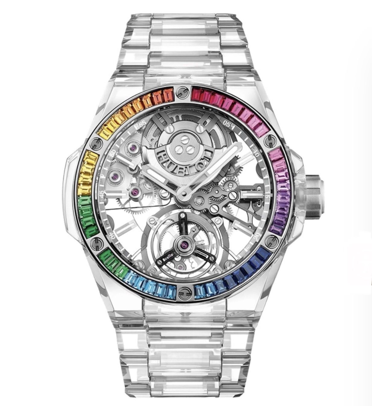 Hublot 455.JX.0120.JX.4099 Big Bang Integrated Tourbillon Full Sapphire Rainbow 43mm Product information PRICE: $495,000.00 Key Features This timepiece features a 43mm sapphire case paired with a high quality . It showcases a distinctive sapphire dial and is powered by a precise automatic winding movement. The watch is designed with a water resistance of up to 30m. Description Hublot 455.JX.0120.JX.4099 Hublot Big Bang Integrated Tourbillon Full Sapphire Rainbow 43mm General Gender: Men's Warranty: 3 Year Reference Number: 455.JX.0120.JX.4099 Condition: New Case Material: Polished Purple Sapphire Crystal, Sapphire crystal bezel with 48 baguette-cut colored stones Caseback: Exhibition Case Diameter ⌀: 43mm Glass: Sapphire With Anti-reflective Treatment Water Resistance: 30m Shape: Round Dial & Hands Color: Sapphire Crystal Dial Markers: Indexes Hands: Luminous Movement & Functions Functions:!Hours, Minutes, Tourbillon Movement Type: Automatic Movement Description: HUB6035 Manufacture Automatic Tourbillon Movement, 72 Hours Power Reserve ——— EXQUISITE TIMEPIECES INC. Contact Nick (Sales Manager) SHOWROOM ADDRESS: 4380 Gulfshore Blvd., N. Suite 800, Naples, Fl 34103 EMAIL: team@exquisitetimepieces.com PHONE: Int: (+1)239.262.4545