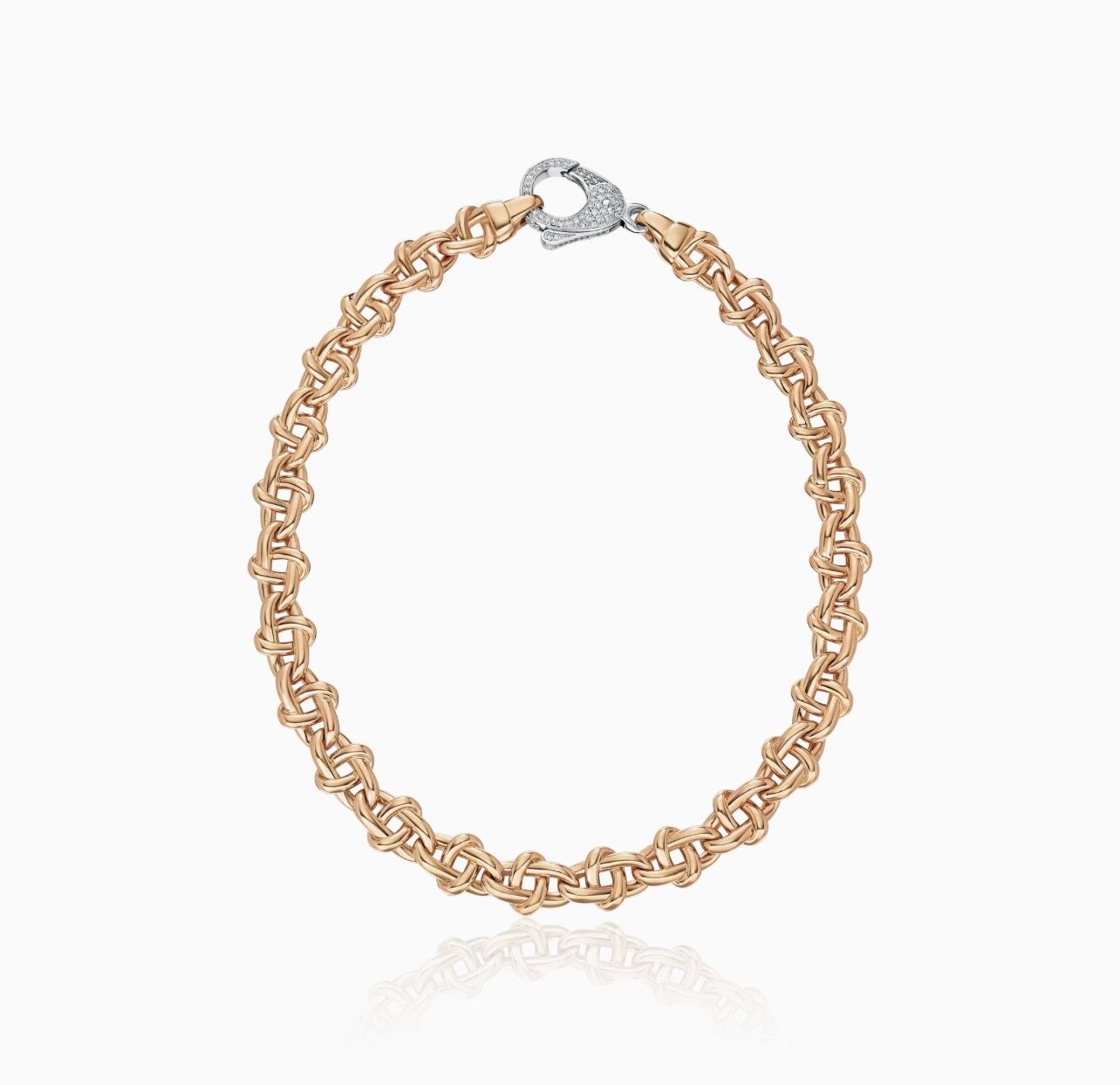 Our infinity knot symbolises an eternity, with bold and organic lines creating these unique and exclusive designs within the collection. The solid 18ct rose gold links create this powerful necklace and a striking feature diamond set clasp.