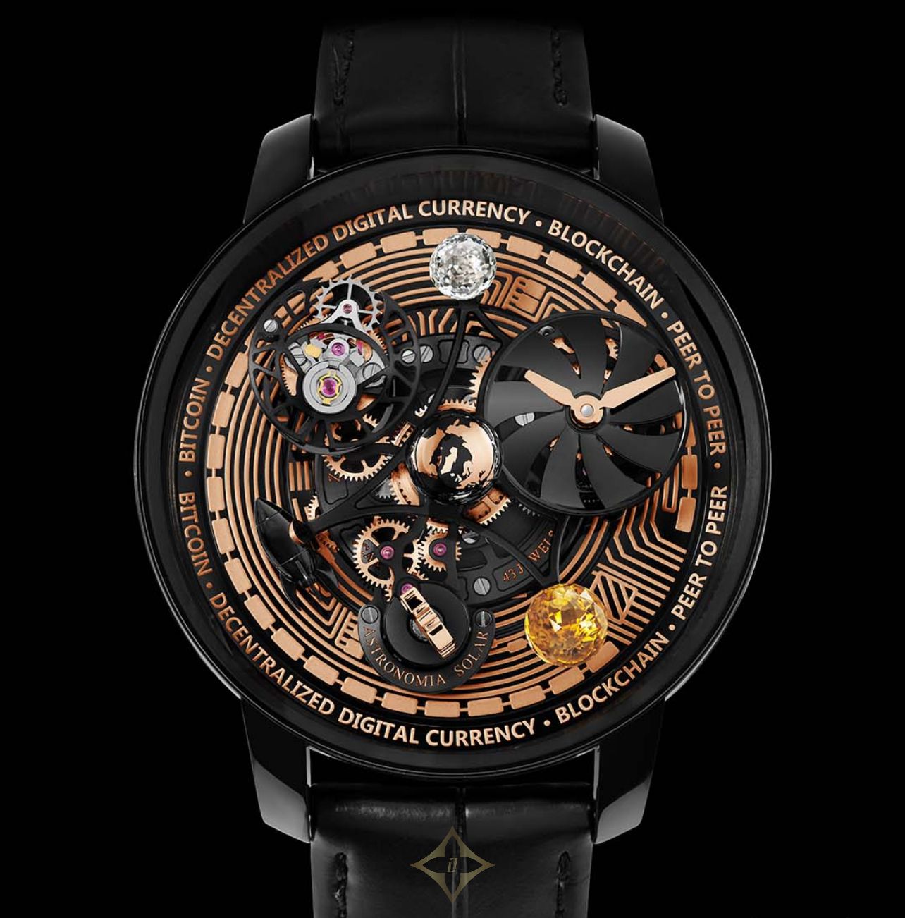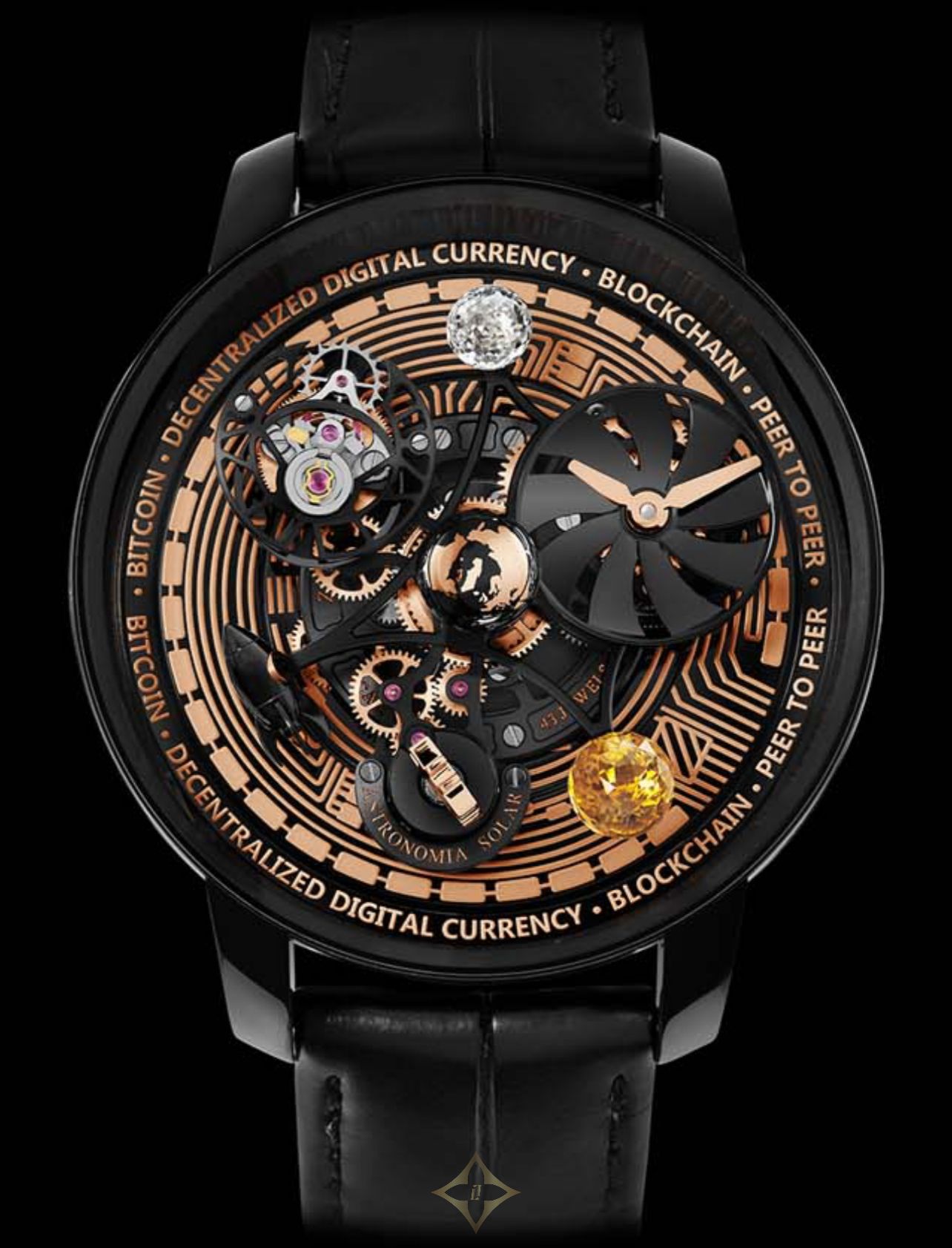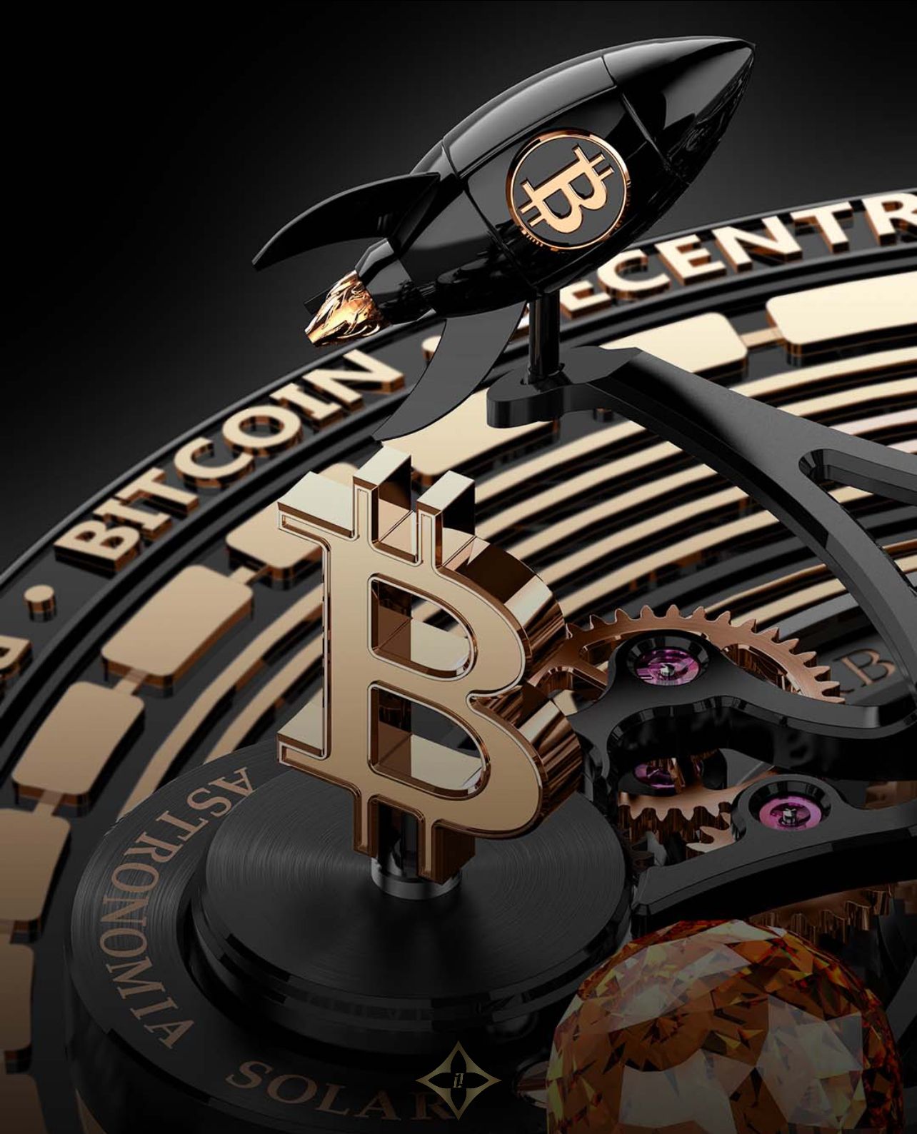 On this version of the Astronomia Solar movement, the rotating prongs, be they functional of purely decorative, serve a higher purpose. They provide the piece with the necessary symbolic substance that makes this an entirely cryptocurrency-oriented piece. A rotating Bitcoin currency logo. A yellow sapphire sun, a 1ct diamond moon and a golden Earth. A miniature black rocketship, complete with flaming reactor and Bitcoin sign to reach for the moon. All these symbols tell the story of the advent of the first cryptocurrency, from abstraction to reality, from outlier to a mainstay of the financial system.