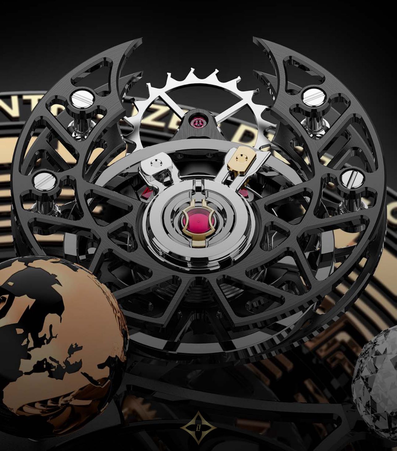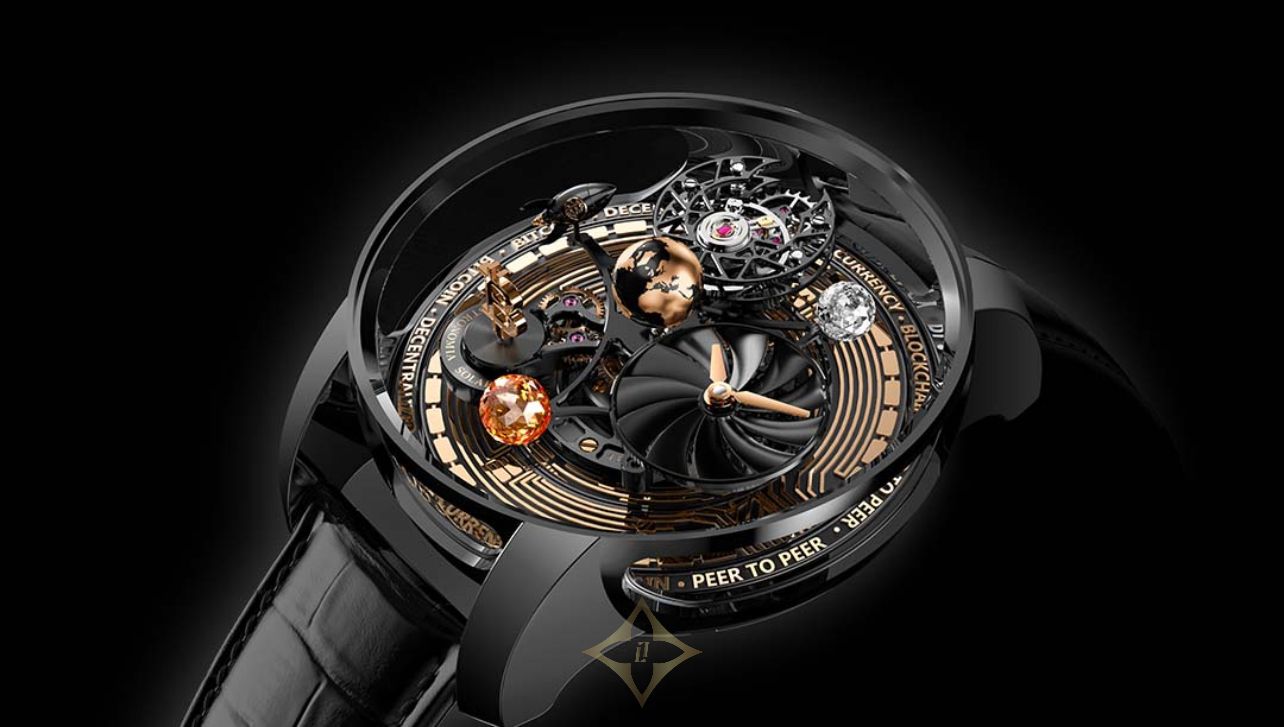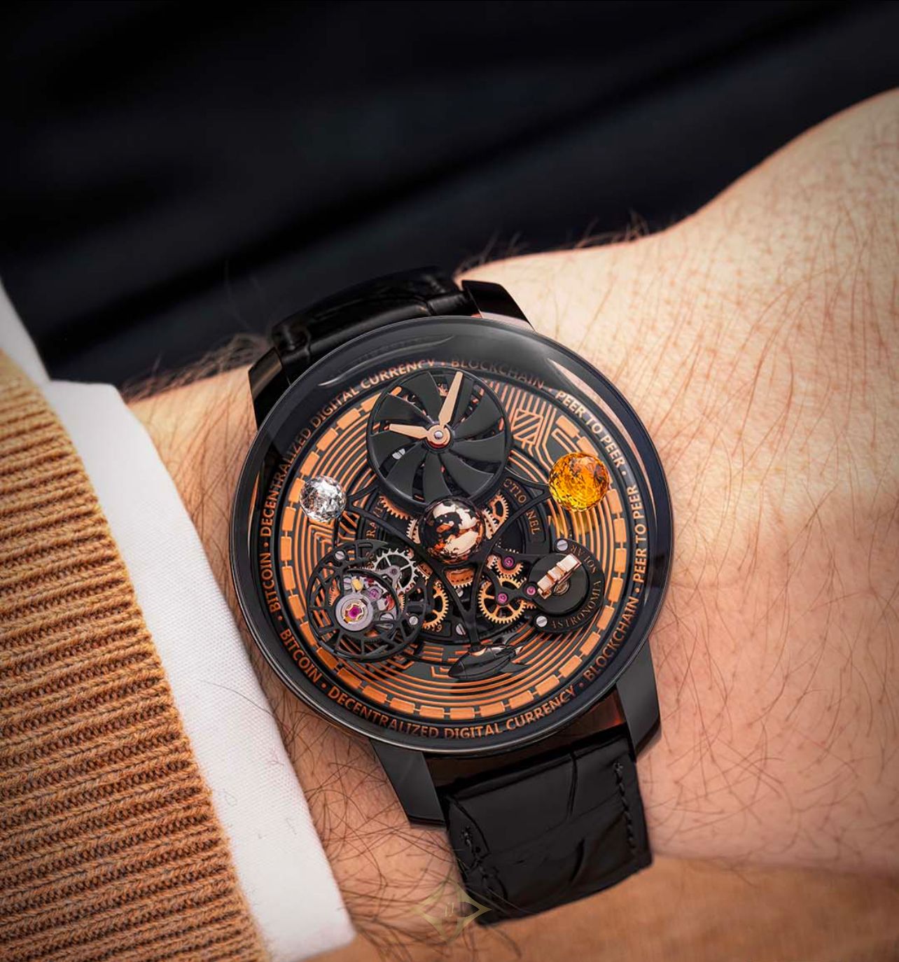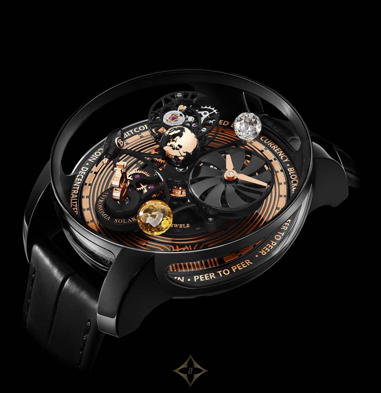 On this version of the Astronomia Solar movement, the rotating prongs, be they functional of purely decorative, serve a higher purpose. They provide the piece with the necessary symbolic substance that makes this an entirely cryptocurrency-oriented piece. A rotating Bitcoin currency logo. A yellow sapphire sun, a 1ct diamond moon and a golden Earth. A miniature black rocketship, complete with flaming reactor and Bitcoin sign to reach for the moon. All these symbols tell the story of the advent of the first cryptocurrency, from abstraction to reality, from outlier to a mainstay of the financial system.