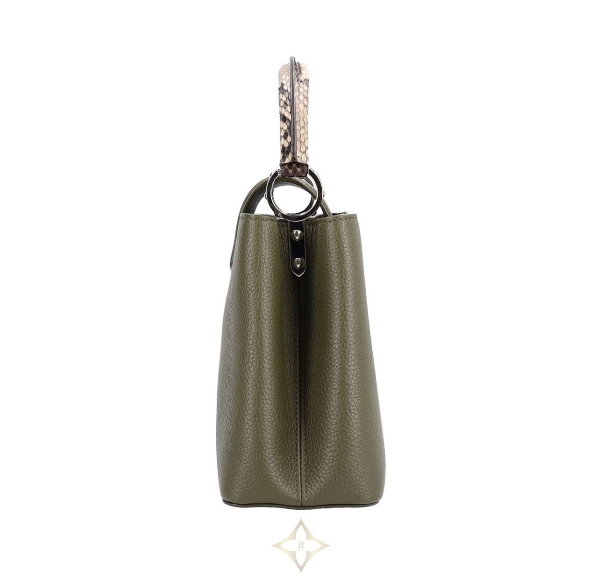 Elevate your style with the Louis Vuitton Capucines MM in Khaki. Crafted from luxurious Taurillon leather and exotic snake skin, this bag is a true statement piece. Perfect for those who crave elegance with a touch of wild sophistication. A must-have for any fashion-forward wardrobe!