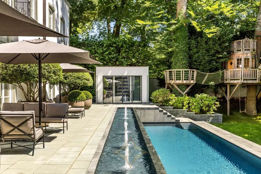 The spatial concept is perfectly thought out: On the first floor there are spacious living and representative rooms as well as a ravishingly beautiful conservatory. In front of this is a spacious terrace with water features and a pool with pool house. The upper floor is designed as a luxurious master floor with a master bedroom, two dressing rooms and two bathrooms; there are also two guest suites. There are four (children’s) bedrooms on the top floor, each with its own bathroom. The basement houses a spectacular hammam, a fitness area, a wine cellar and a cinema. A self-sufficient, bright 2-room granny apartment with its own entrance completes this villa property.