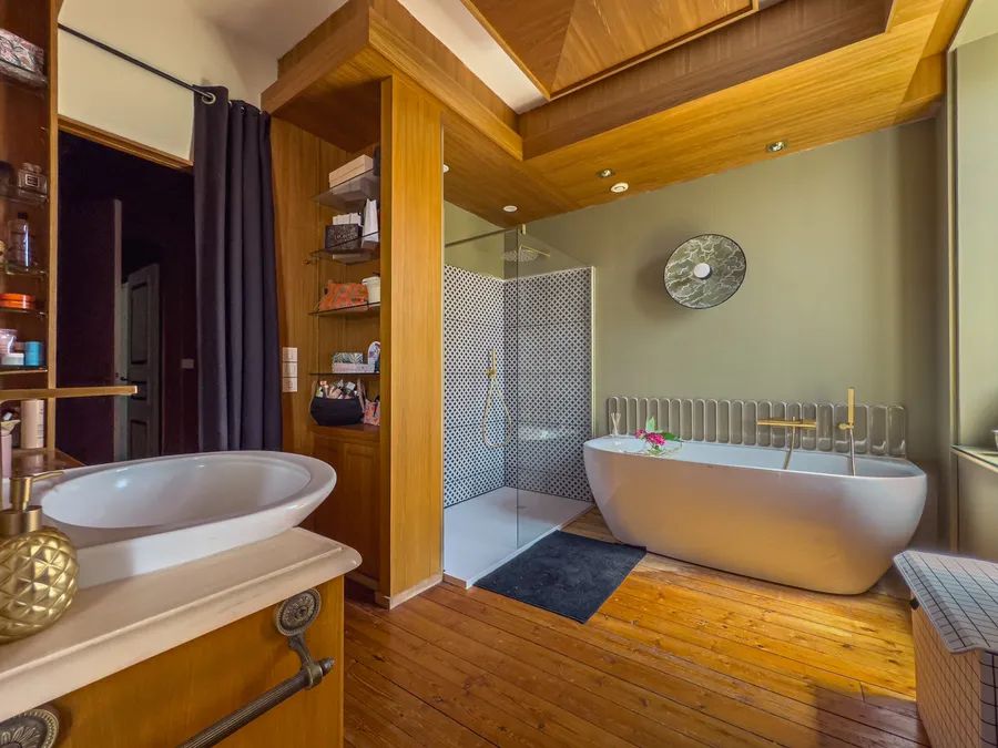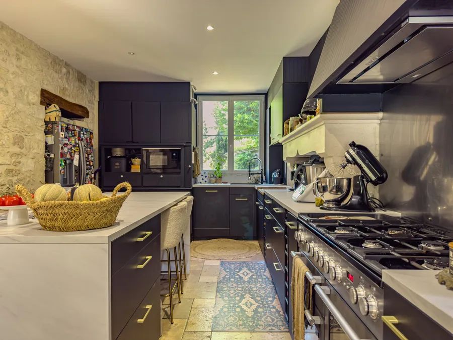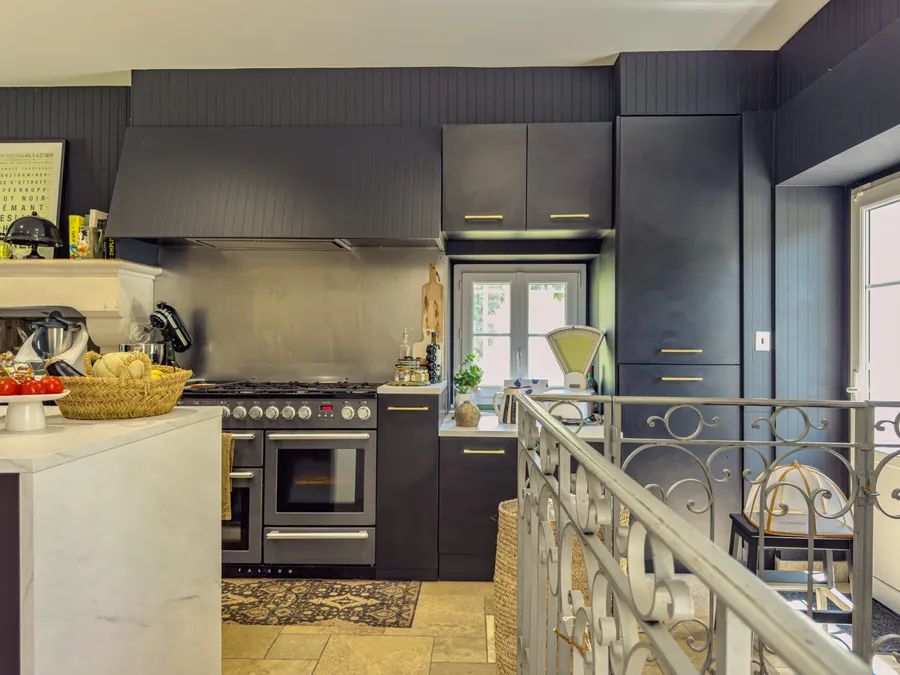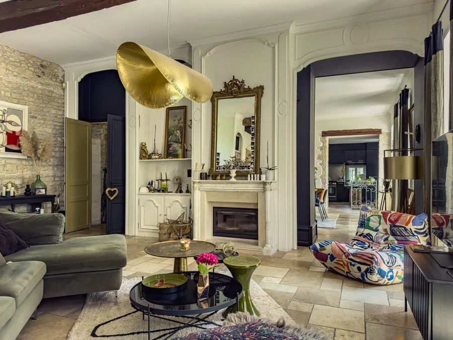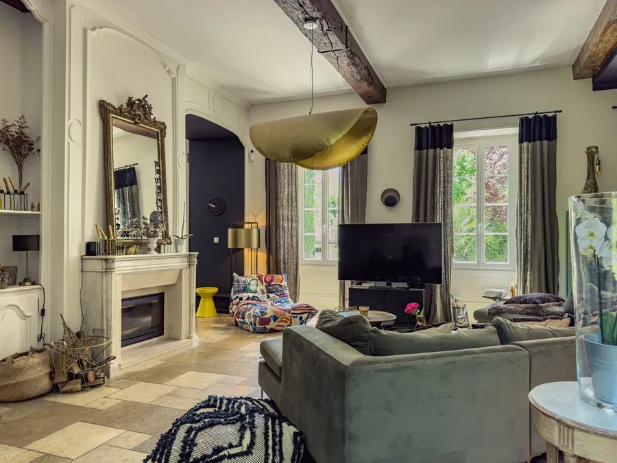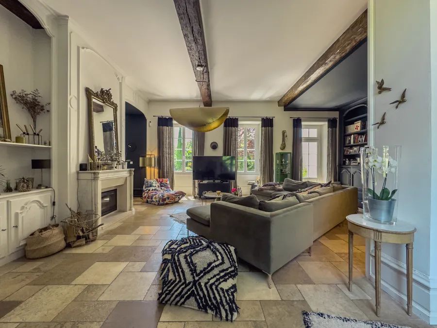 A refined entrance leads to an exceptional 50 m² living area, bathed in natural light thanks to its south-facing exposure, highlighted by an elegant fireplace. The high-end, fully equipped kitchen offers direct access to a traditional vaulted cellar, perfectly blending authenticity and prestige.