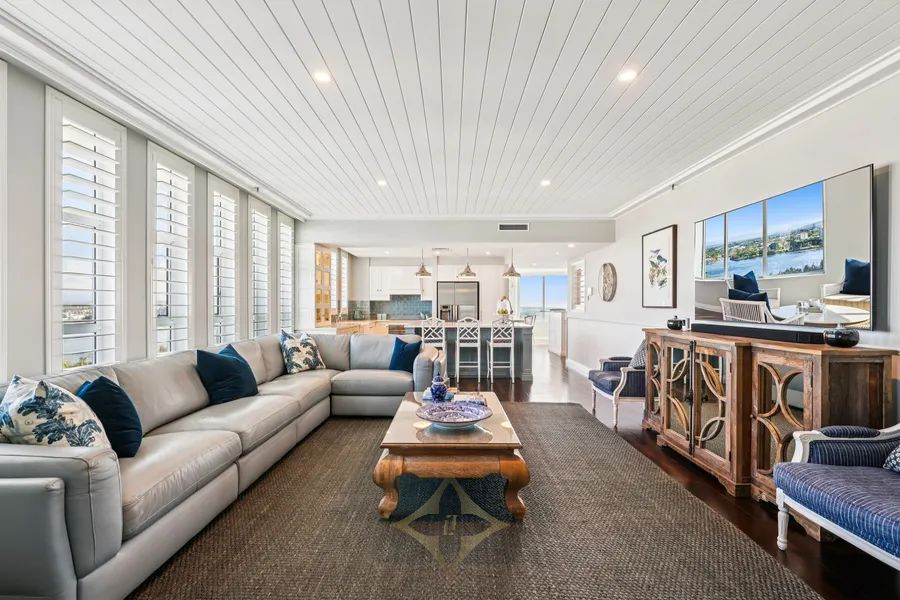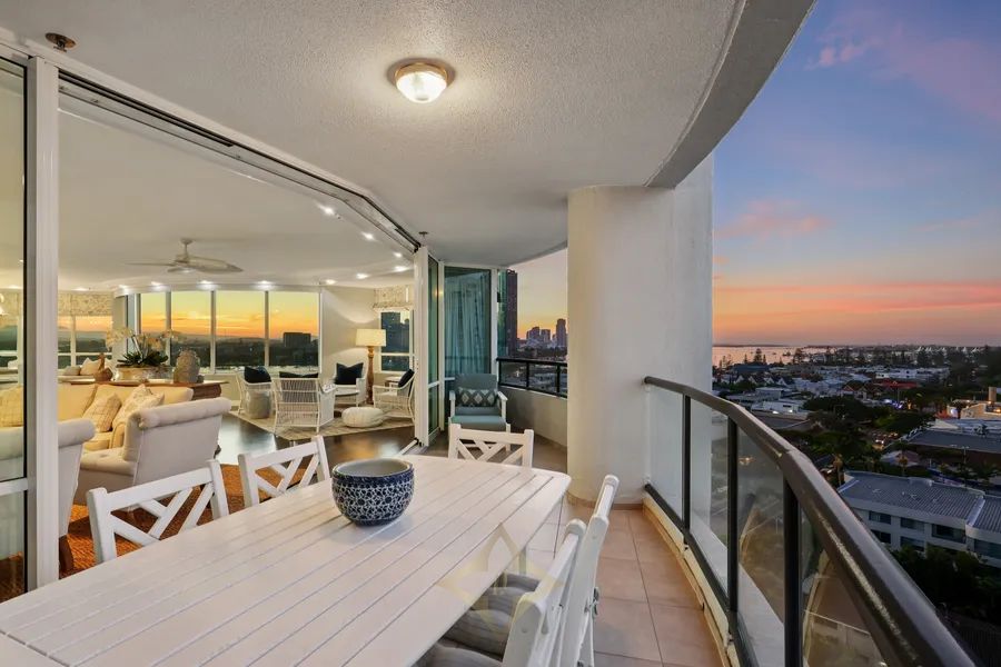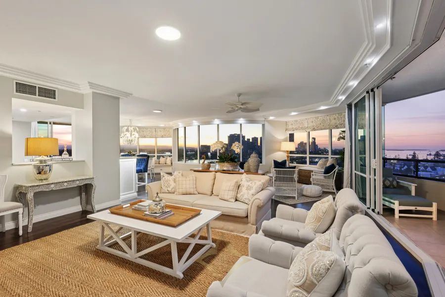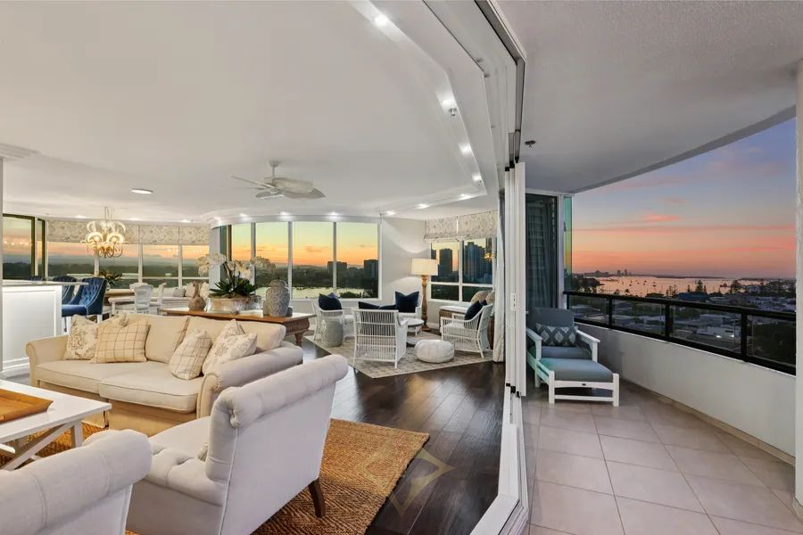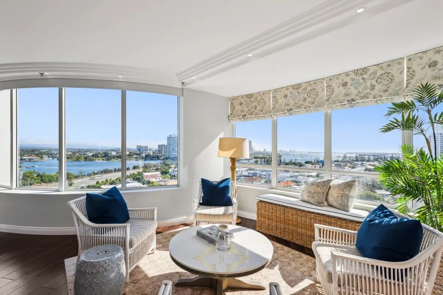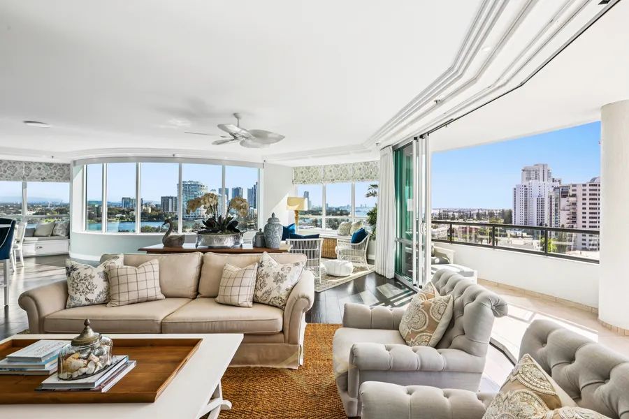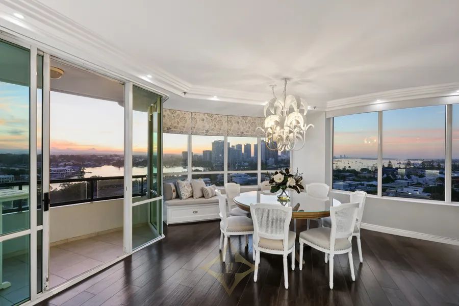 prestigious residential apartment buildings in Main Beach, and now showcases a beautifully renovated entrance and foyer. Apartment 39, a sub-penthouse on the 10th level, ranks among the finest apartments, featuring 324sqm of interior space and undercover balconies, plus side-by-side security parking spaces on title - first time on the market in almost 14 years.