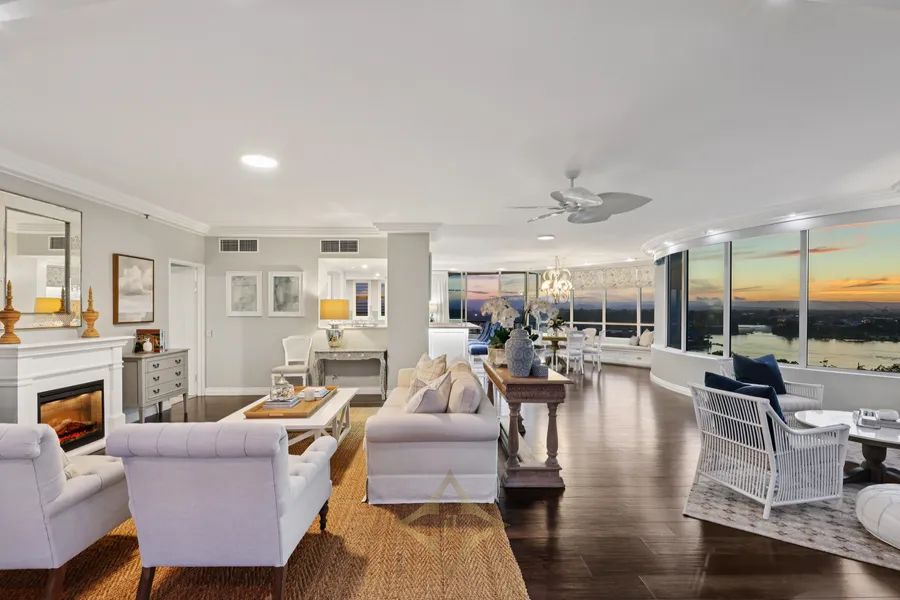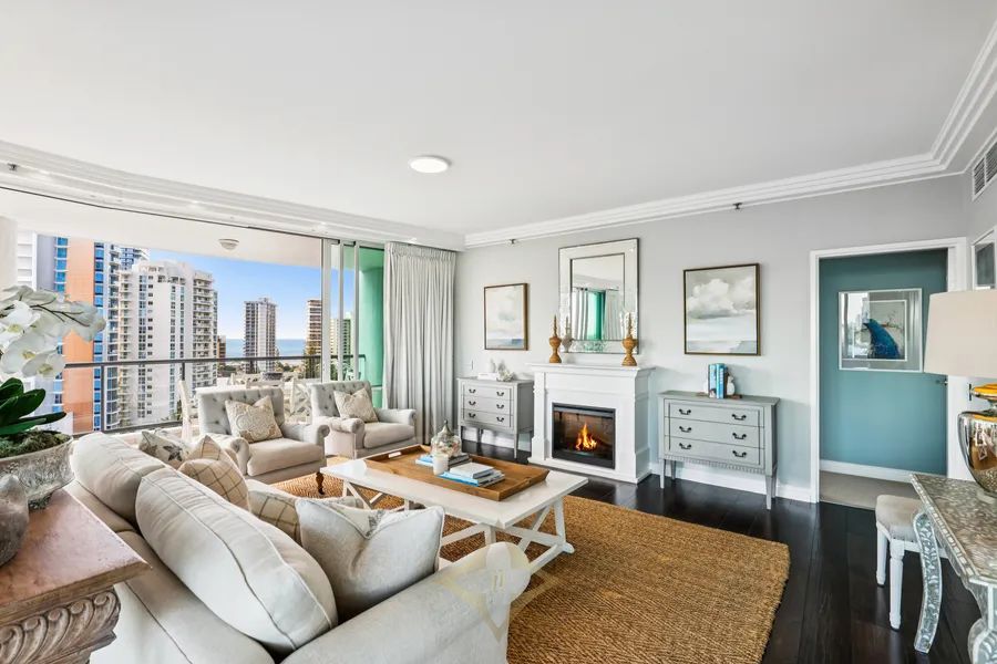 With only two apartments on the 10th level, the views remain unobstructed across the Broadwater. Apartment 39 has a sought-after coastal location, offering the opportunity to catch the sunrise over the ocean from every bedroom and enjoy sunset views of the hinterland from the main living areas and western balcony. The Gold Coast’s dazzling skyline captivates in the evening, complemented by a winter night warmed by the living room fireplace.