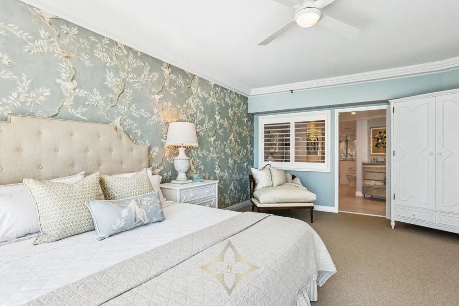 • Primary suite adorned with bespoke, nature-inspired wallpaper