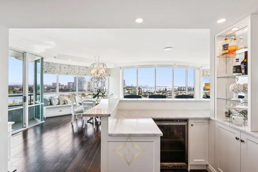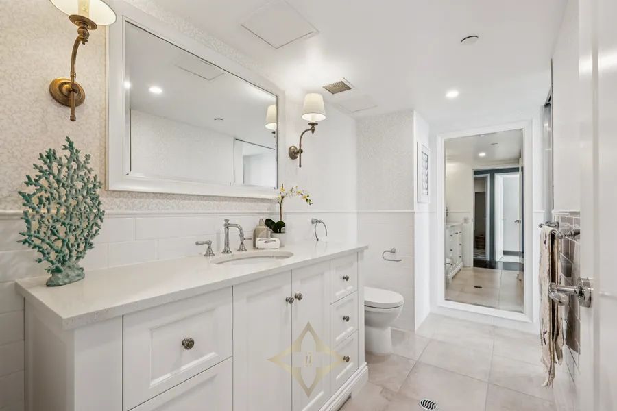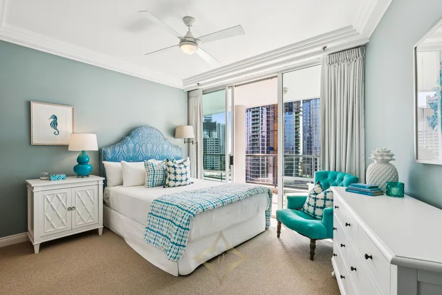 coastal elegance and calm optimism, enhances the apartment’s views of the blue sea and Broadwater. Walnut-finished floors throughout the primary living areas are complemented by plush carpeting to each of the three ensuited bedrooms. The standout primary bedroom has a walk-in wardrobe and dressing room that dreams are made of, complete with custom joinery. From Parisian bed linens to an Italian marble gourmet dining island in the kitchen, the apartment is brimming with exquisite craftsmanship, luxurious finishes, and bespoke furnishings.