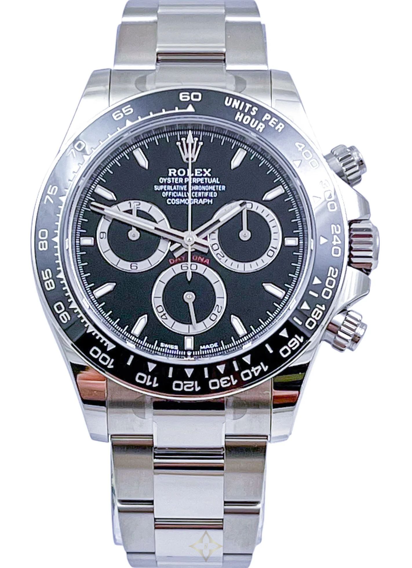 Rolex 2024 Oyster Perpetual Black Cosmograph Daytona NEW MODEL Steel Mens Wristwatch REF 126500LN UNWORN with Box and Papers PERFECT. PRICE: $59,950.00 Rolex 2024 Oyster Perpetual Black Cosmograph Daytona Steel Mens Wristwatch REF 126500LN UNWORN with Box and Papers PERFECT. This Watch is Available TAX FREE at $52,550.00 Stock #: 3591 Brand: Rolex Model: Daytona Date/Circa: 2024 NEW MODEL Reference Number: 126500LN Case Material: Stainless Steel Movement / Calibre: Automatic Strap / Bracelet: Oyster Stainless Steel Clasp: Flip Lock Clasp Case Measurements: 40mm Dial: Black with Silver chapter rings to the sub dials. Condition: 10/10 UNWORN Accessories: Complete with Box Papers ——— About Time 324 Remuera Road, Remuera, Auckland 1050, New Zealand Phone: +64 09 281 4138 Email: admin@abouttime.co.nz