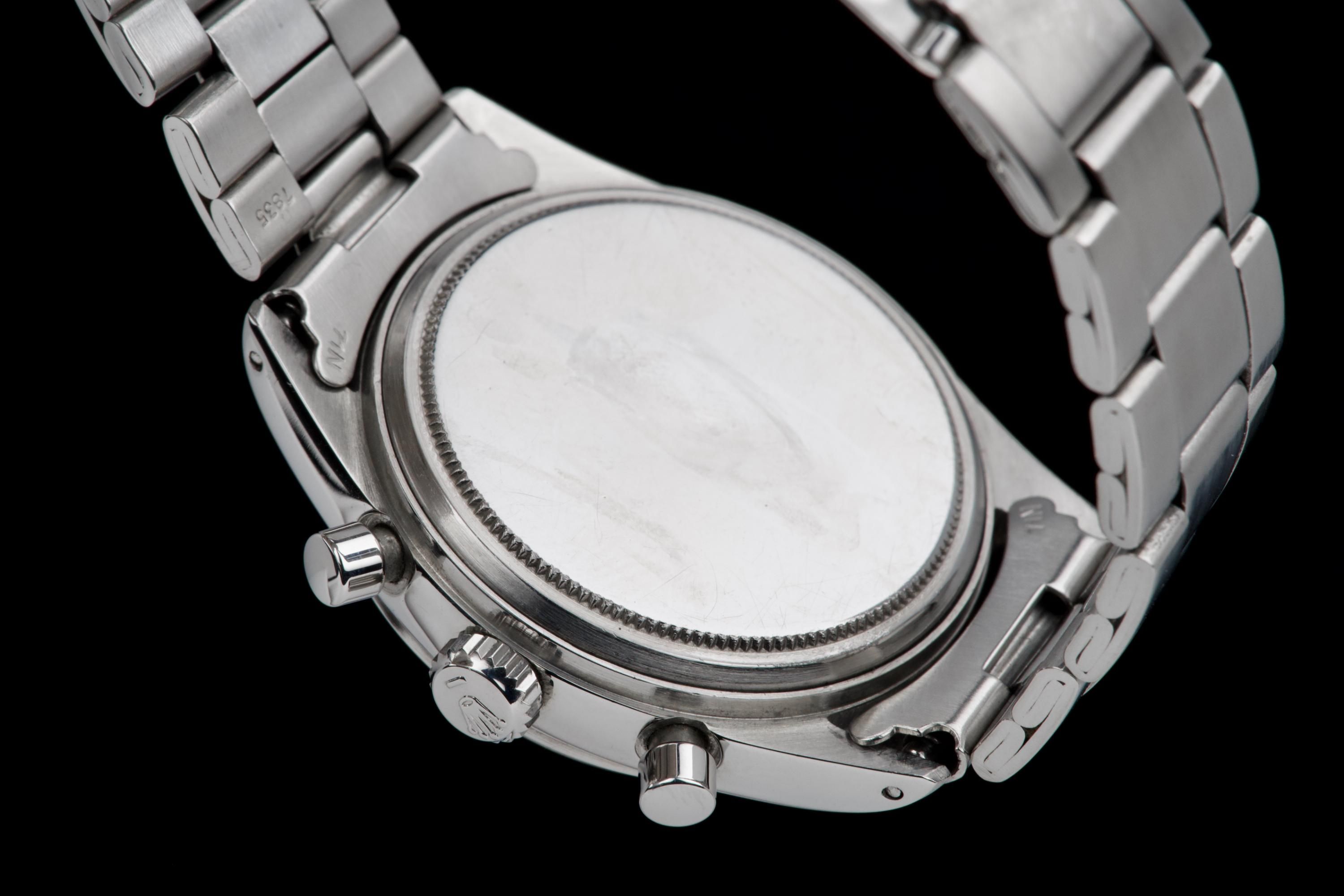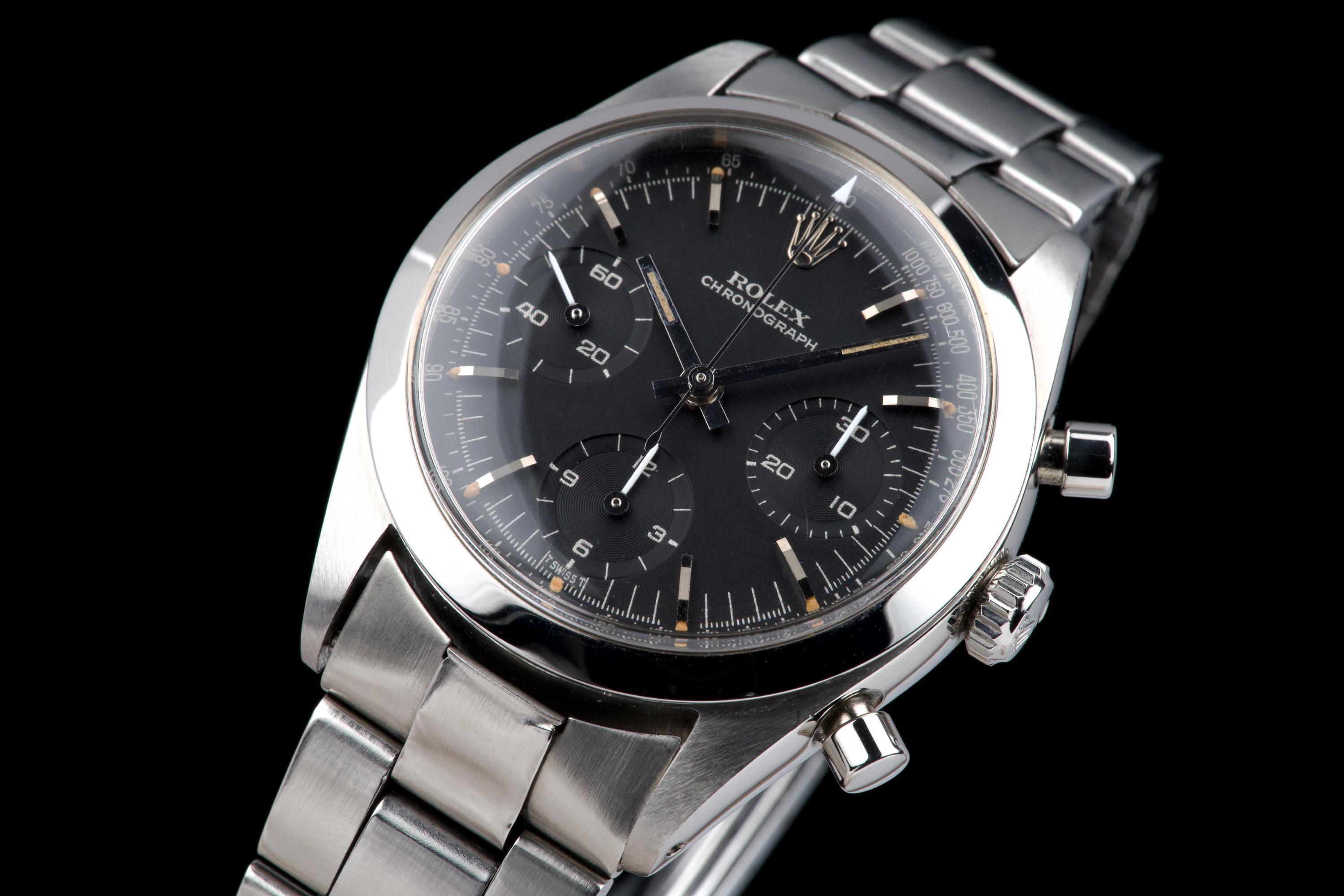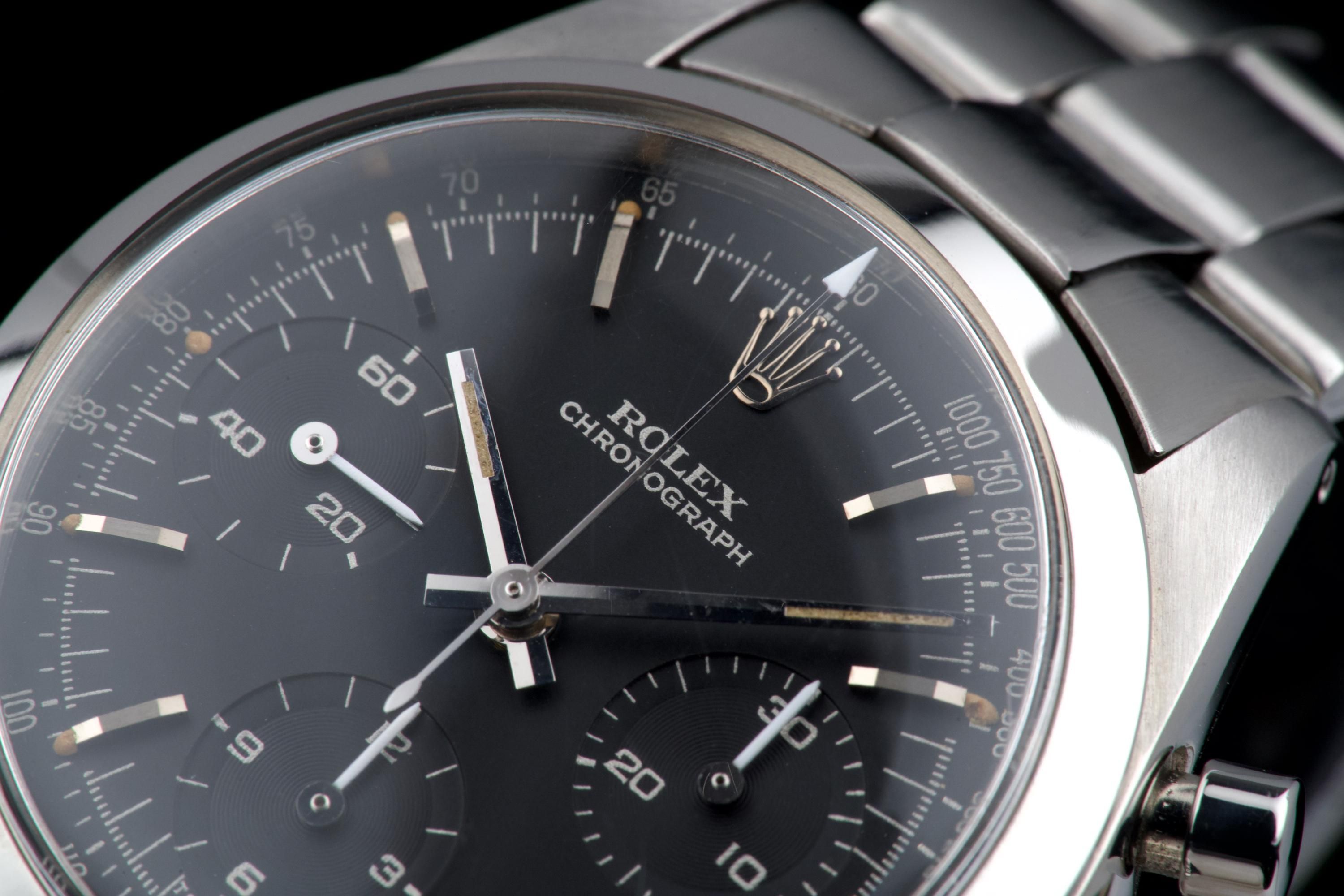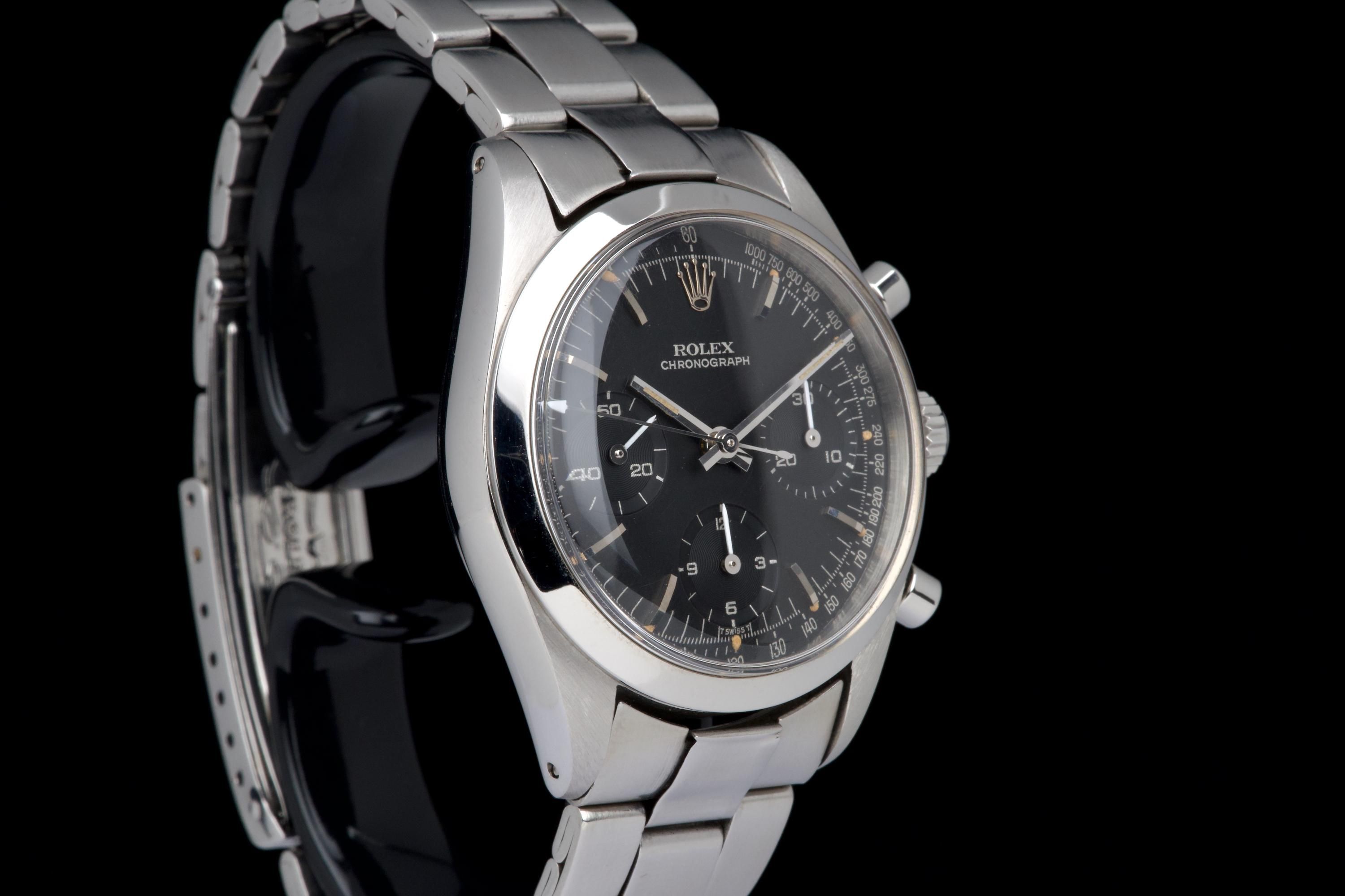 An outstanding example of the legendary Rolex Pre-Daytona reference 6238, fitted with a rare black matte dial with silver printing. This watch comes from an important French collector who owned it for the past 15 years. The case is in superb condition — thick, sharp, and very well preserved — showing extremely light signs of polishing, if any. The reference and serial numbers between the lugs are perfectly crisp and look nearly new, indicating very little wear throughout its life. The steel bezel remains perfectly flat with its original shape, and both the plexiglass crystal and crown are original. The original black matte dial with silver printing is exceptional. The luminous plots are intact, with slight degradation at 2 and 3 o’clock — a very common and honest trait for early Rolex chronographs of this era, confirming the dial has not been relumed. The original hands match perfectly. It is fitted with a folded 7835 Oyster bracelet with the rare 71N endlinks, slightly stretched but in very good condition, dated 4.67. The caliber 722 movement is clean and has been checked by our watchmaker. It features the “ROW” engraving, indicating it was originally delivered to the U.S. market. The caseback is correctly stamped 6238 and bears two Rolex Paris service engravings from 1996 and 2000. A superb, rare, and honest example of the black-dial 6238 Pre-Daytona — among the most sought-after vintage Rolex chronographs, combining excellent condition, collector provenance, and originality.