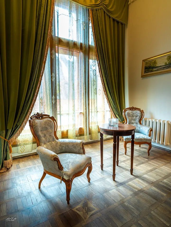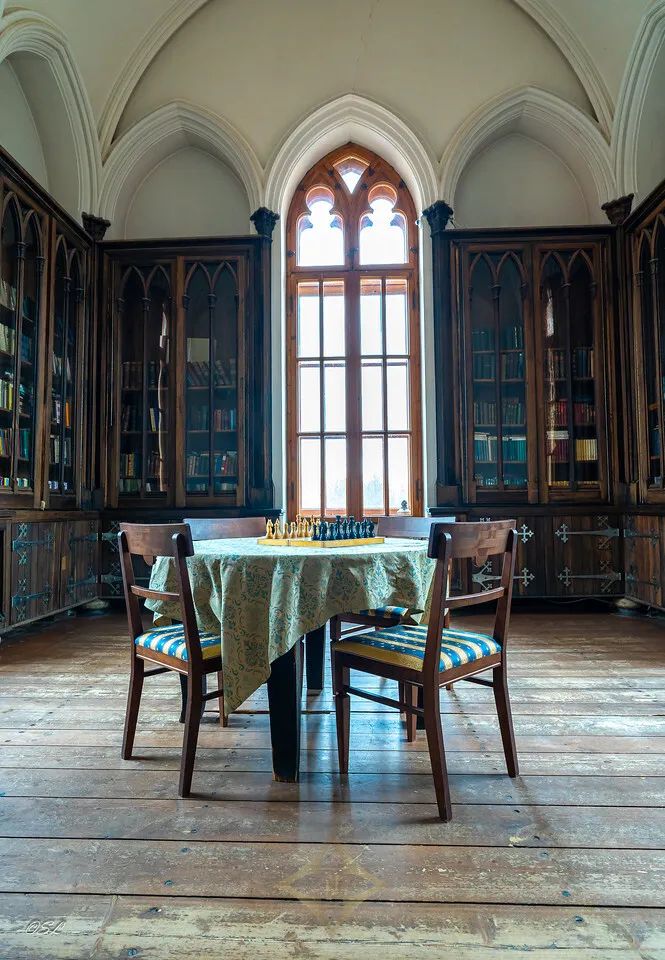 With its many towers, wings, and windows, the castle consists of an impressive main castle building with balconies, covered walkways, artwork including statues in and on its exterior and interior walls, an elegant courtyard, a chapel, a large wooden staircase, hardwood parquet floors, and beautiful views of the grounds and nearby ponds.