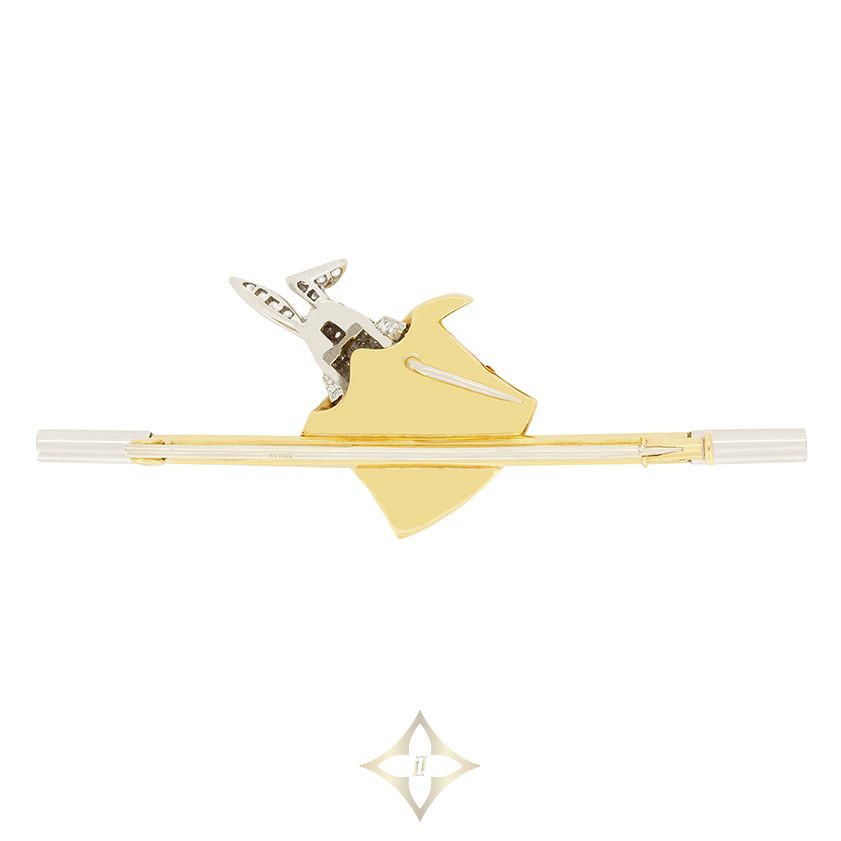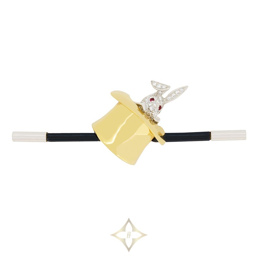 This delightful brooch comes from the designer Asprey. The whimsical design features a diamond set, 18 carat white gold rabbit emerging from a hat. The bunny sparkles with 0.60 carats of round brilliant diamonds, graded F in colour and VVS in clarity, while its ruby eyes, totalling 0.02 carats, bring the bunny to life. Crafted from 18-carat yellow gold, the hat is sat upon an onyx magic wand for a striking contrast. Ingeniously designed, the bunny pops up and down out of the hat with movable arms. Complete with its original box and paperwork, this enchanting piece is a true treasure.