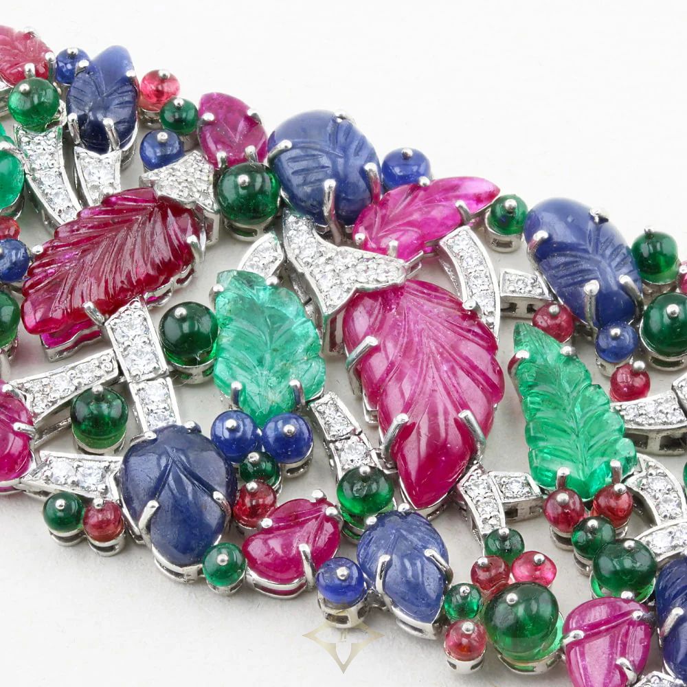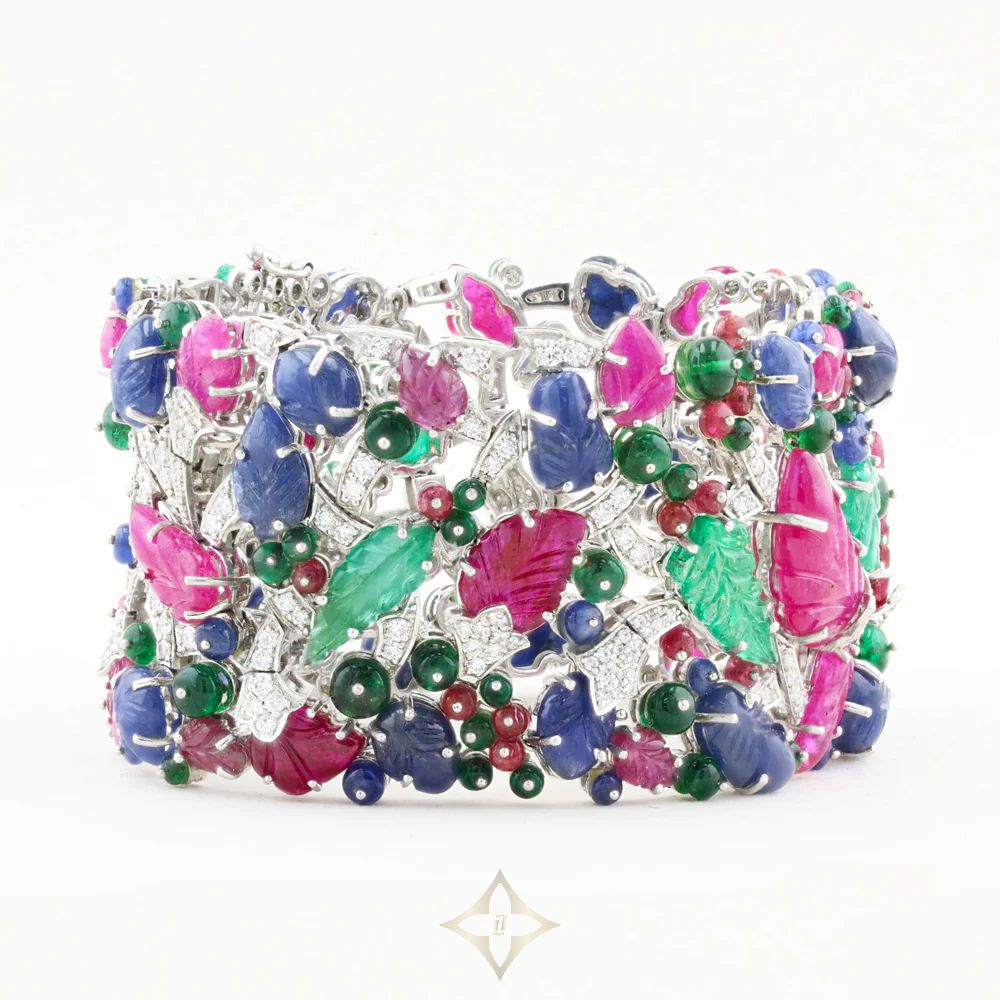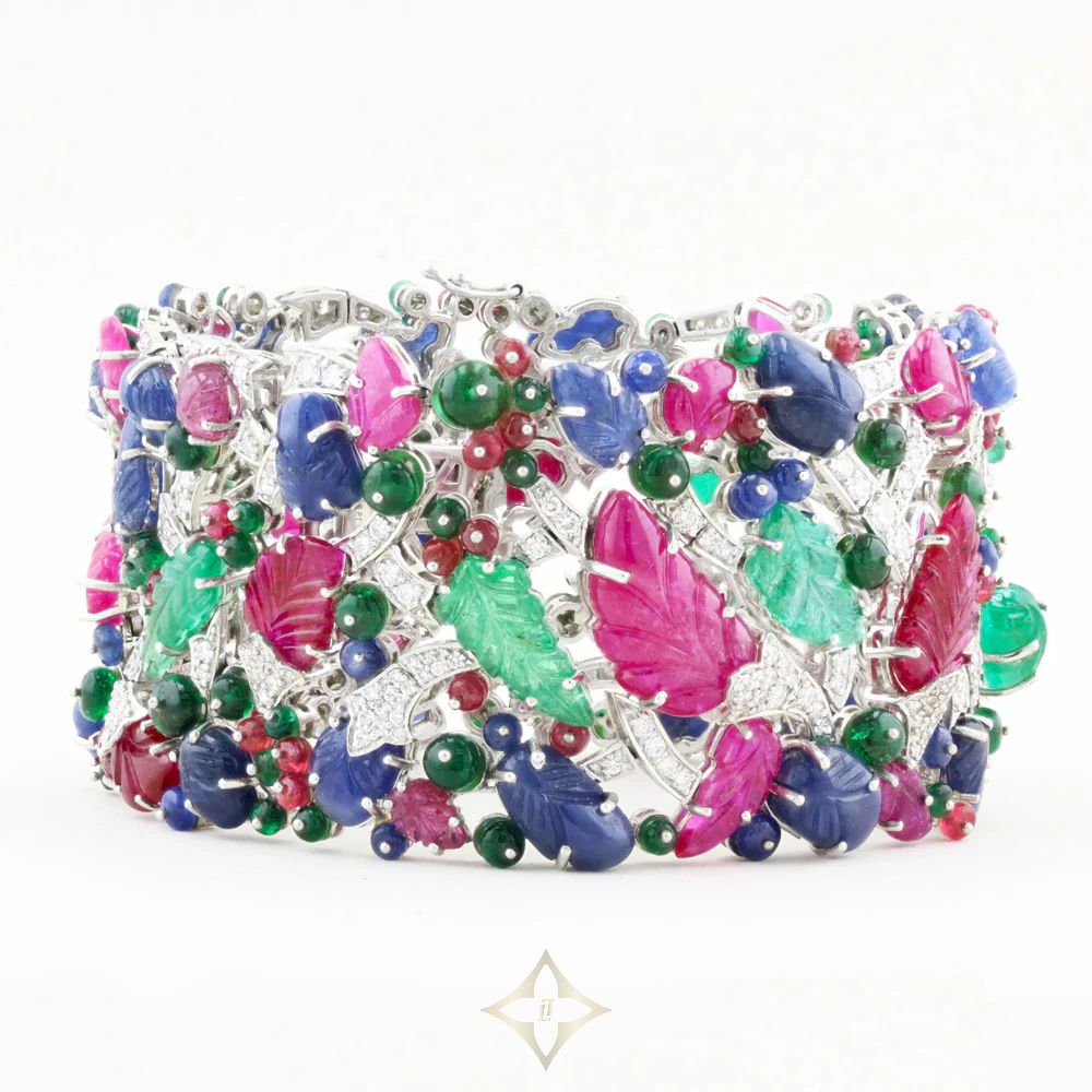 This eye-catching bracelet is grain set with a total 6.38ct of natural diamonds (G-H in colour and SI1-SI2 clarity) alongside 12.52ct of emerald beads, 6.74ct of sapphire beads and 6.64ct of spinel beads. In addition, it features 10.39ct of emerald carvings, 54.99ct of sapphire carvings and 45.24ct of ruby carvings, providing a total coloured gemstone weight of 136.52ct.
