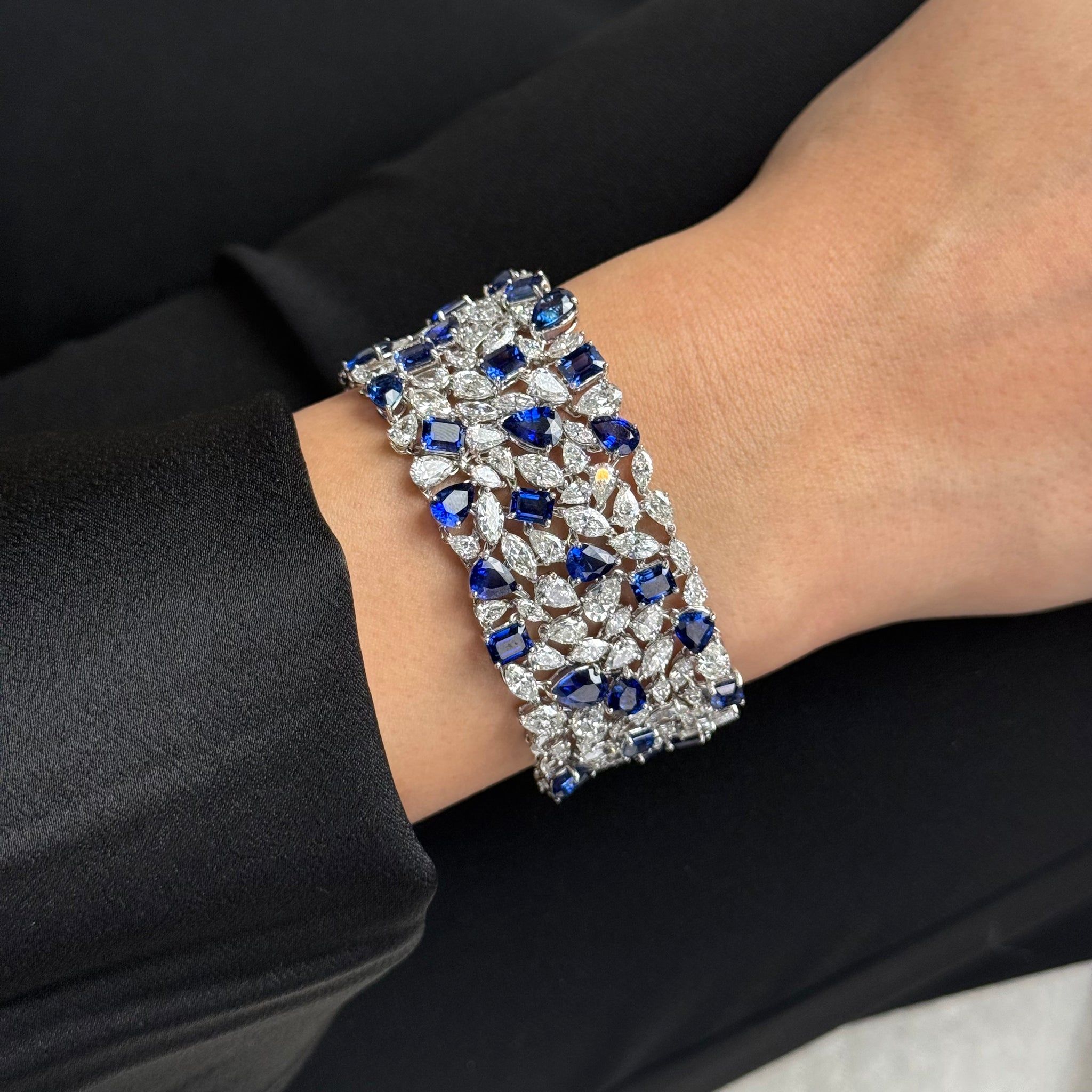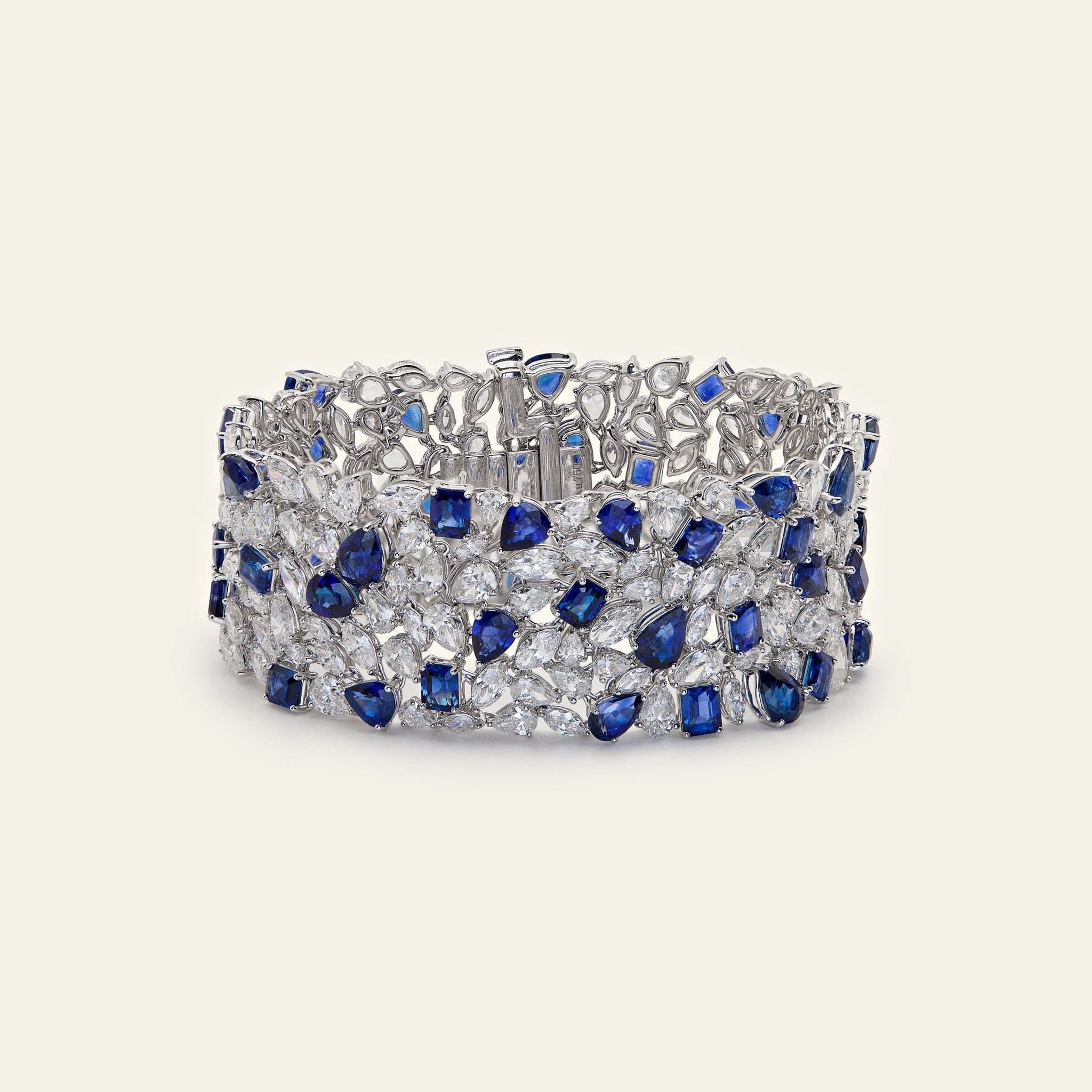 The Royal Blue Ceylon Sapphire and Diamond Bracelet is an exceptional high jewelry design featuring royal blue heated Ceylon sapphires framed by brilliant white diamonds in a fluid composition of pear, and mixed cut stones. The vivid saturation of the natural blue sapphires is enhanced by the surrounding diamonds, creating depth, contrast, and continuous brilliance across the wrist. Designed with an open lattice structure to maximize light reflection while maintaining flexibility and comfort, this sapphire and diamond bracelet balances bold color with refined structure, making it a distinguished statement in fine gemstone jewelry.