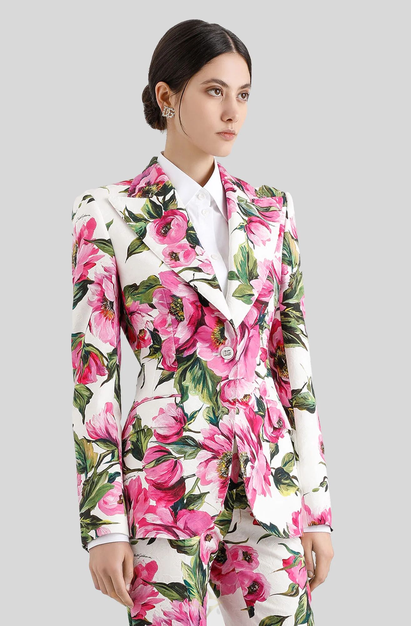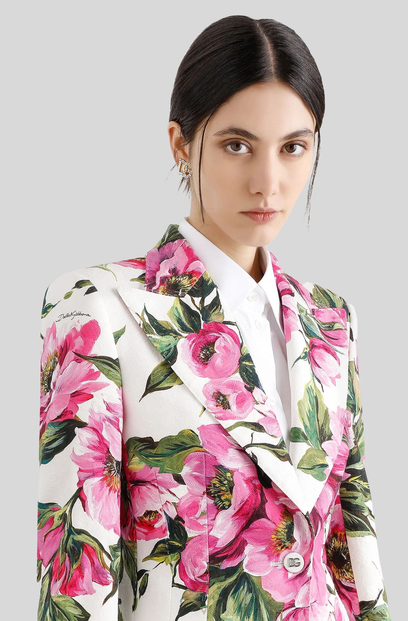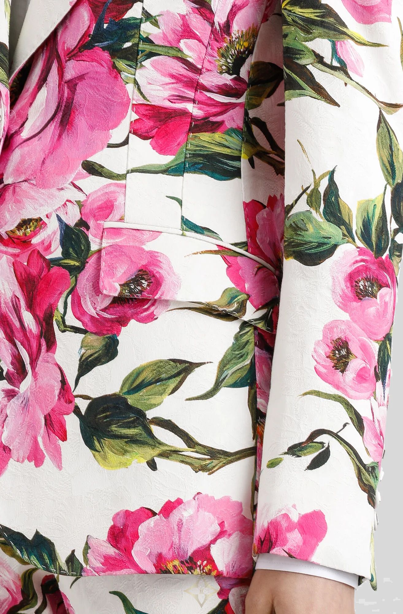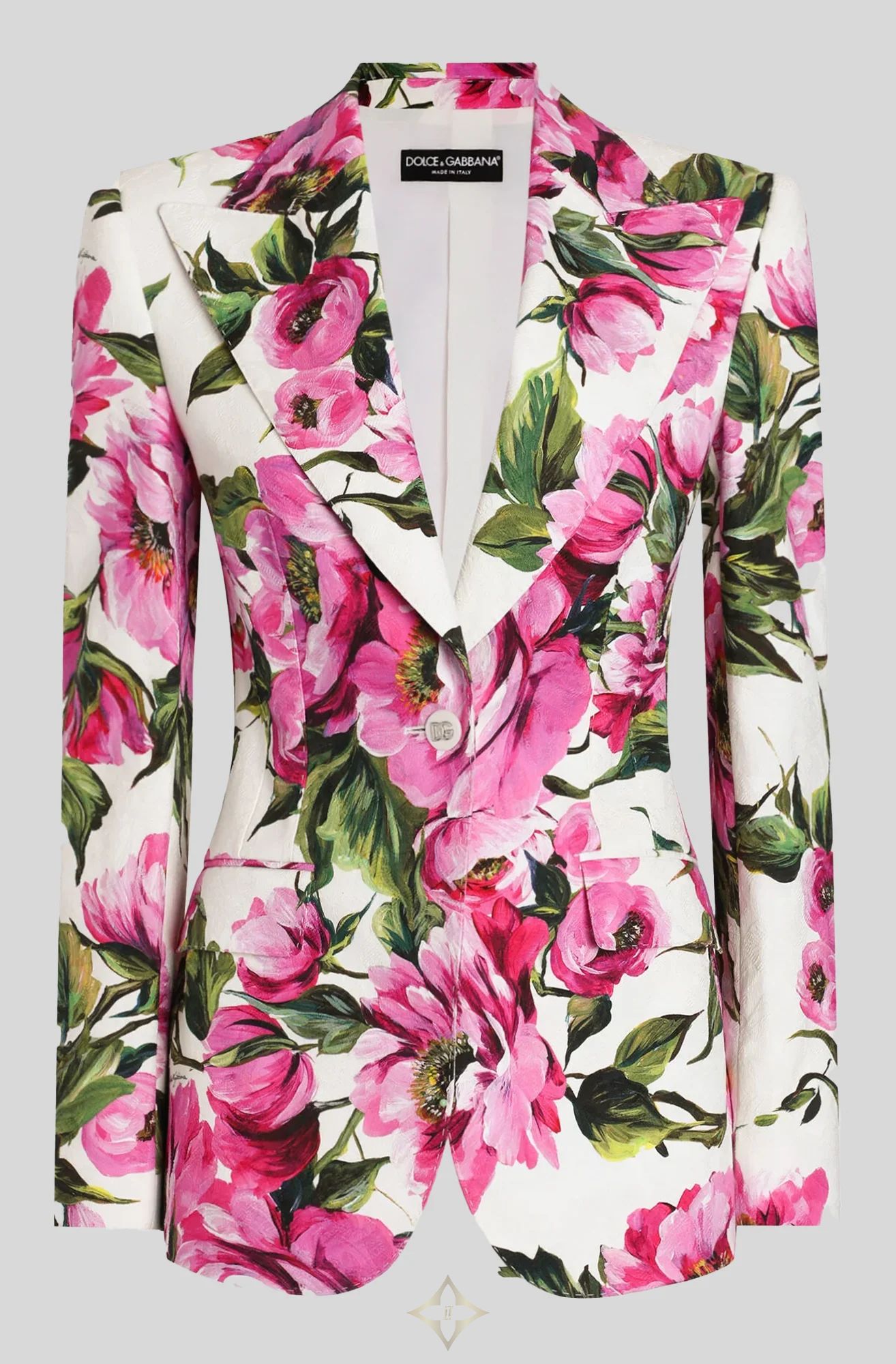 The Jacquard Turlington Jacket in Pink Peony Print by Dolce and Gabbana is crafted from a cotton Jacquard with a silk lining. Sculpted through the body this piece is expertly tailored for a feminine finish.