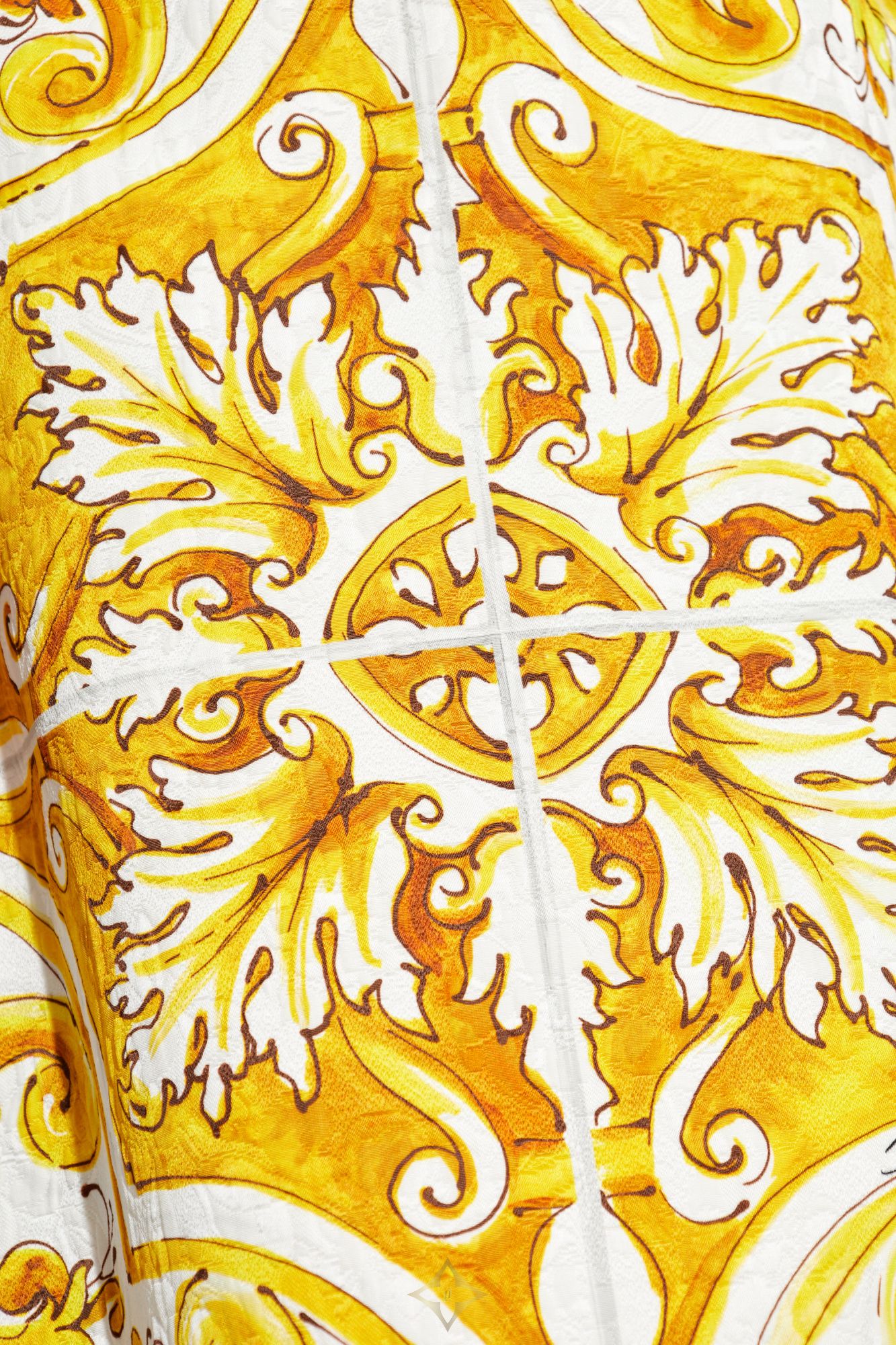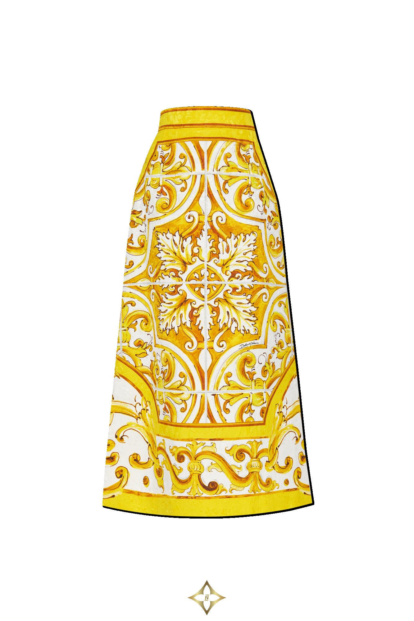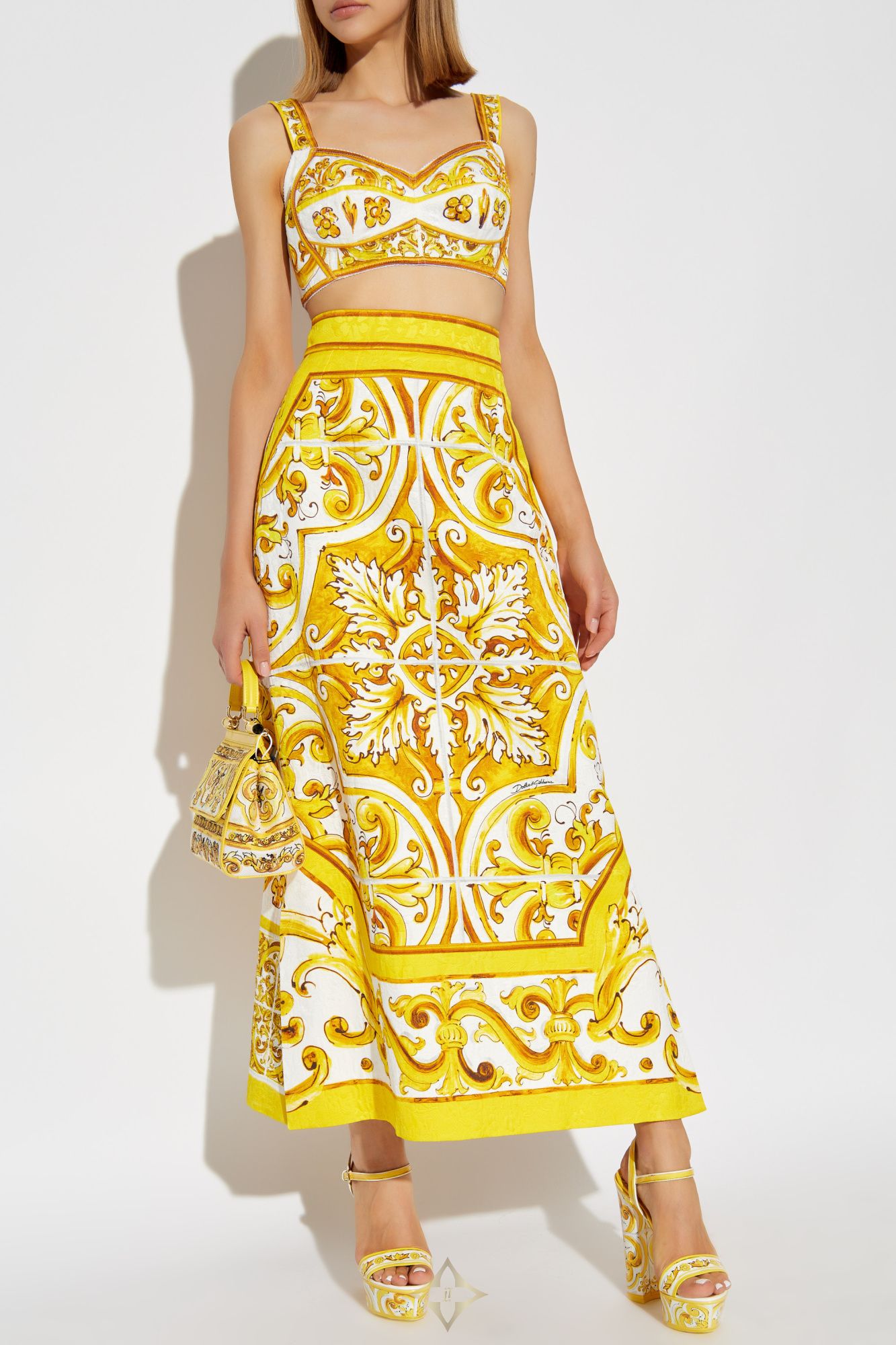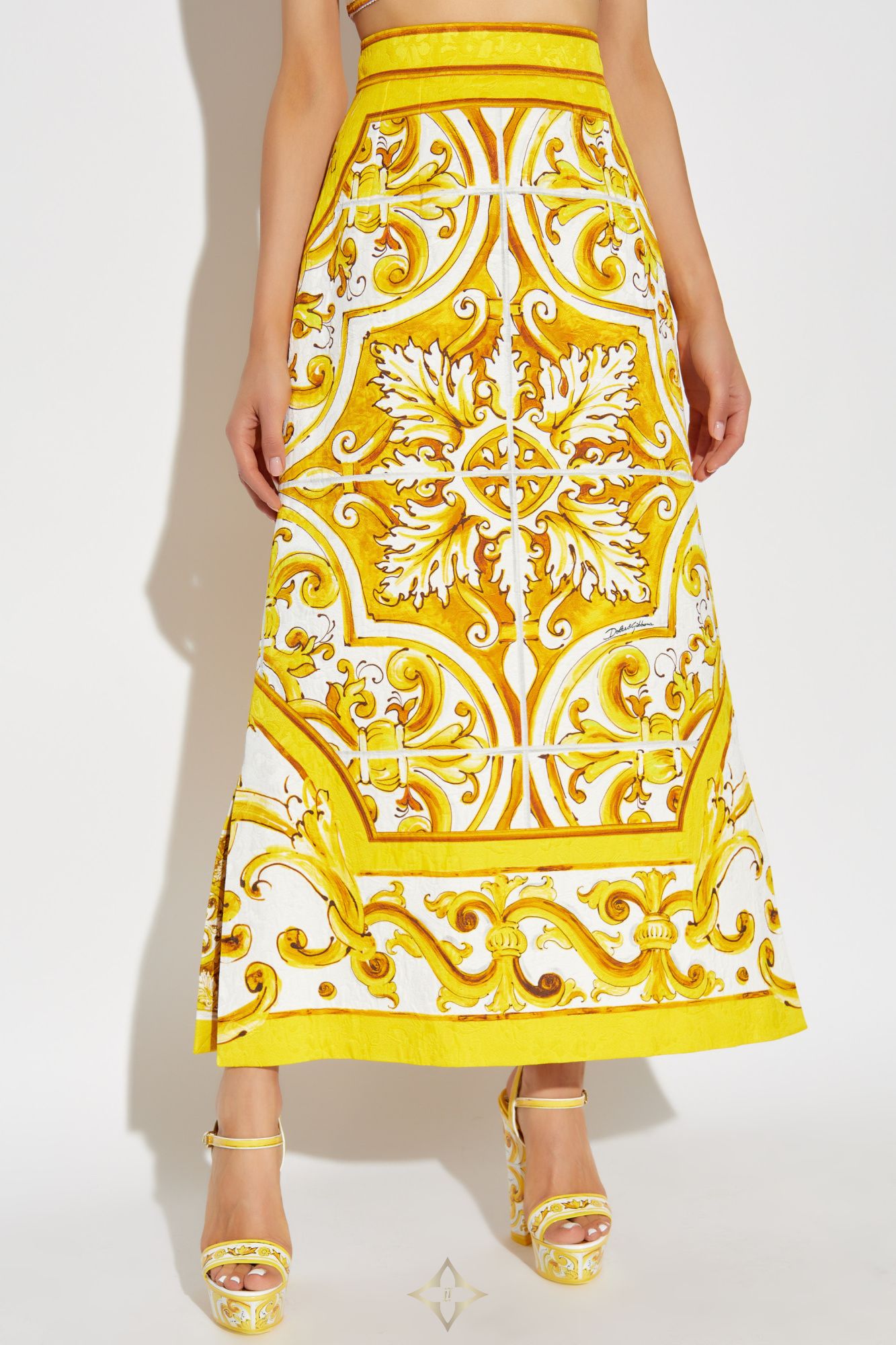 DOLCE & GABBANA PATTERNED SKIRT PRICE: $1,979.00 Taxes and duties included COLOR: YELLOW SYMBOL: F4CUNT FPTAX-HG5DQ DESCRIPTION We present an exclusive patterned skirt from the renowned designer Dolce & Gabbana. This exquisite model from the Italian duo's collection features a classic, baroque pattern in shades of yellow and white, epitomizing luxury and elegance. The skirt has a long, straight form that slightly flares towards the bottom, giving it a unique character and accentuating the silhouette. Made from a blend of the highest quality cotton and rayon, it offers a delicate sheen and smoothness typical of top-tier products. The dominant pattern is symmetrical, intricate floral motifs that adorn both the front and back of the skirt. Details such as the precise finishing of the patterns and the concealed zipper closure at the back attest to its masterful craftsmanship. The skirt reaches the ankles and features a wide waistband that adds elegance and ensures a perfect fit. The absence of visible inscriptions or logos further emphasizes its exclusive nature. COMPOSITION / CAPACITY 67% Cotton 33% Rayon MEASUREMENTS Model`s Measurements Height: 176cm Bust: 85cm Waist: 60cm Hips: 89cm Model is wearing size: 40 ——— VITKAC (Vitkac Sp. zoo.) ul. Górczewska 53, 00-401 Warsaw, Poland VAT: 521 012 50 41 KRS: 0000205145 VITKAC DS Bracka 9, 00-501 Warszawa, Poland Phone: +48 22 699 60 55 Email: customerservice@vitkac.com