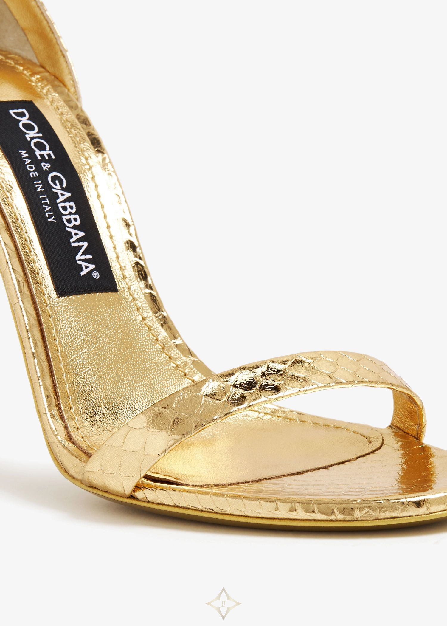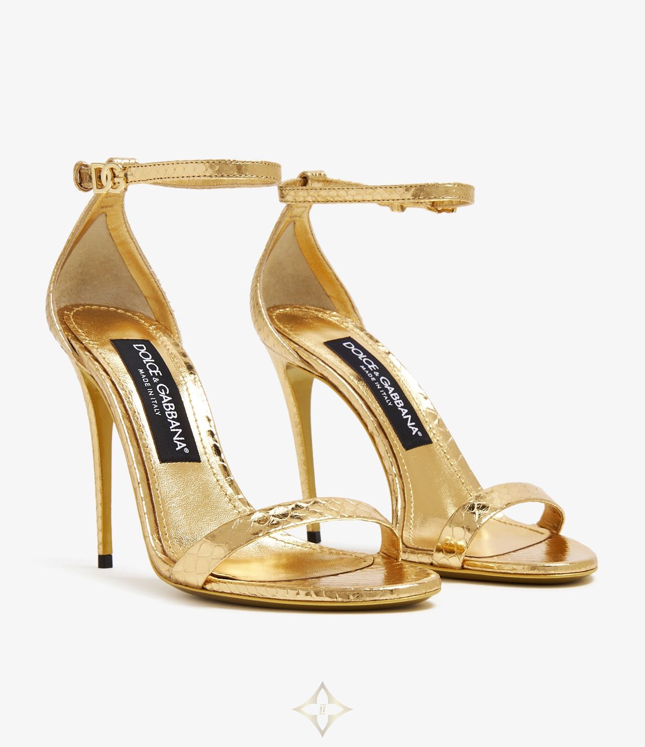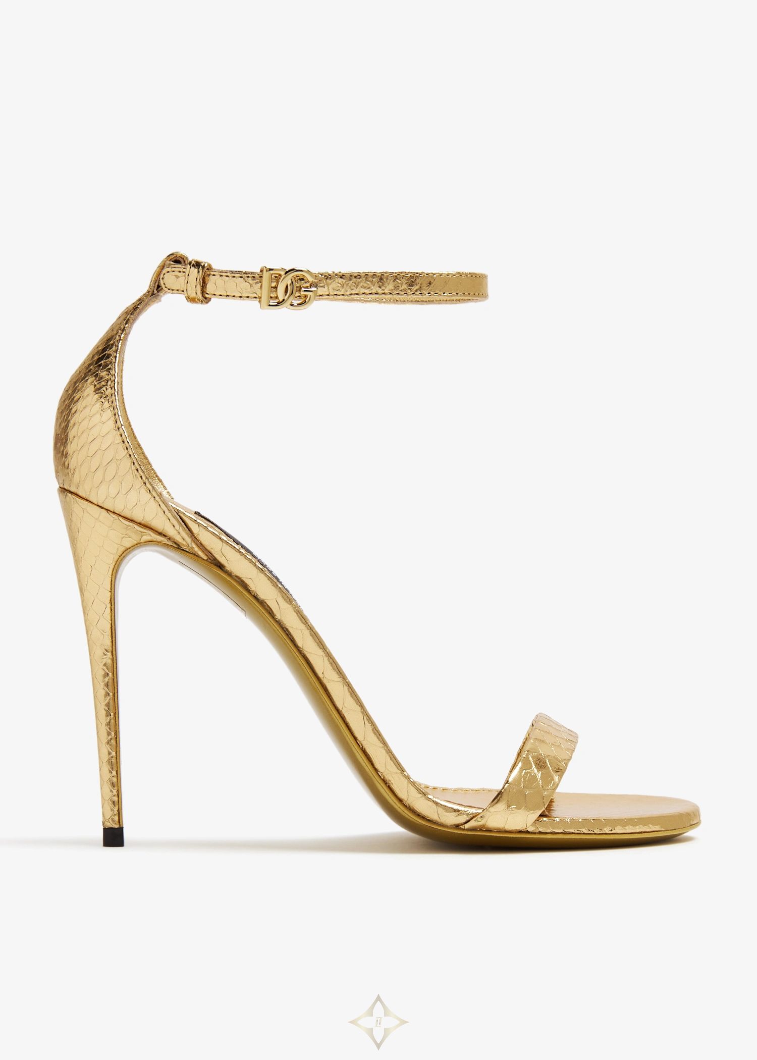 Dolce&Gabbana updates its iconic Keira sandals with a foiled python skin upper so you can step out in confidence and undeniable luxury and glamour. Crafted to a chic almond-shaped toe, they're accented by minimalistic, slim straps, the DG logo fastening on the adjustable ankle strap in gold-tone metal, a slim stiletto heel and durable leather soles.