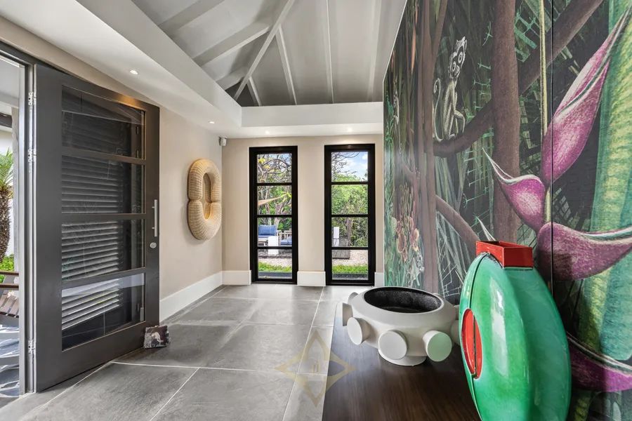 Entrance: Ceiling with artistic lines Upon driving through the electric gate, you’ll pass through a palm-lined, paved driveway. Welcome to the Dutch tropics! To the left is a garage with space for two cars and a golf cart, while across the way, two more cars can be parked under a shade cloth. The first of many terraces is located to the left of the entrance porch. Upon entering the villa, you find yourself in the porch, where large windows flood the space with light. The distinctive ceiling construction, which extends across the entire floor to the top of the house, immediately catches the eye, featuring an artistic interplay of wooden beams and panels.