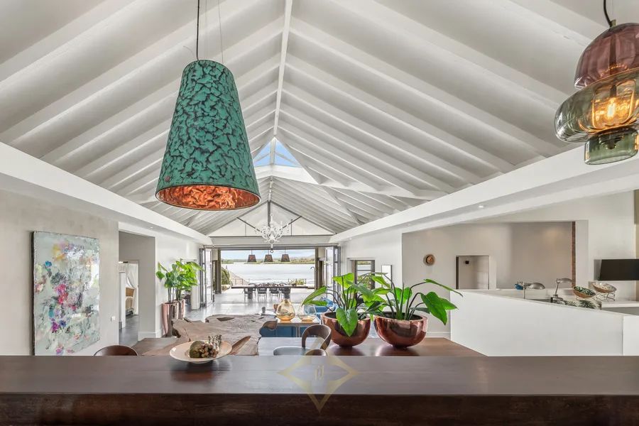 Kitchen: Cook and dine together at the kitchen island The exclusive kitchen is fully equipped. The cabinet wall houses a Sub-Zero refrigerator, Viking wine coolers, and a coffee niche. Cooking is a breeze on the six-burner Viking gas stove, and with the two ovens, a combination oven, and a steam oven also integrated into the cabinet wall, preparing a meal is effortless. The heart of the kitchen is the island, which includes a dishwasher, a concrete countertop, a sink with a faucet, and a Quooker. Large drawers are located underneath. Do you enjoy cooking in company? This kitchen has ample space to try out the tastiest local recipes together. Those who prefer to watch can sit on one of the stools at the bar section of the island, where you can also enjoy a meal together. All this while looking out over the tranquil bay through the French doors and windows.