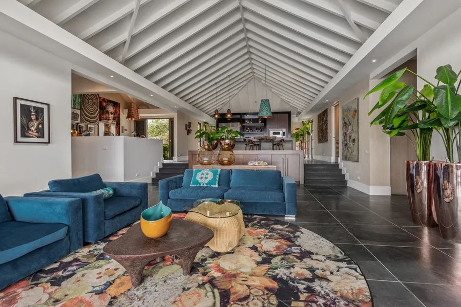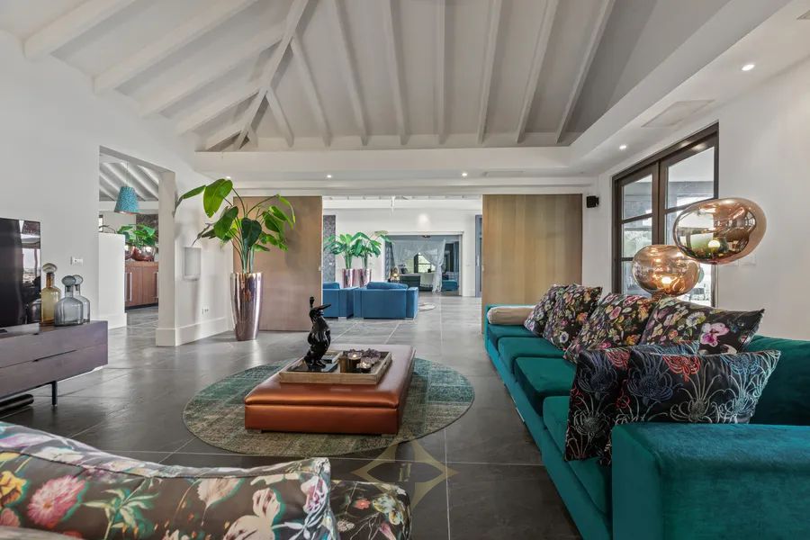 Living Room: The bright blue Caribbean sky blends with the interior The artistic lines of the ceiling are beautifully highlighted in the cozy living room. In the middle of the room, some ceiling panels have been replaced with glass. The radiant blue Caribbean sky visible through the glass perfectly complements the blue, comfortable sofas and matching armchairs. Design lamps by Philippe Starck add to the lighting and the allure of the decor. Under the three marble-look tables of different sizes lies an elegant round rug with a vibrant floral print. Nearby, a cognac-colored pouf serves as both a seat and a side table. The furniture and accessories blend seamlessly with the TV annex relaxation space, which can be closed off with sliding doors. Two sofas and a pouf in the same blue as those in the living room reinforce the unity in interior design. Four tables on a round rug, a floral-patterned armchair, and a wooden TV cabinet complete the decor. This room also receives plenty of natural light through the two sets of French doors, two shuttered windows, and a central door. It’s a wonderful place to retreat.