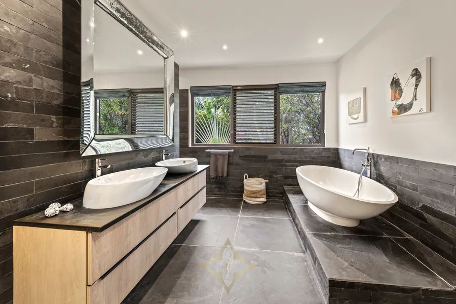 En-suite Bathroom: A tranquil view from the bathtub You can indulge in ultimate relaxation and self-care in the surprisingly large en-suite bathroom on the living floor, illuminated by ceiling spotlights. The bathroom features a freestanding wall with double sinks and a vanity unit. Behind the wall, there’s a walk-in toilet area with a hanging toilet and bidet, as well as a walk-in shower section. The tropical garden visible through the window evokes a beautifully framed still life. Are you more of a bath lover? That wish is fulfilled with the chic freestanding bathtub on the platform, complete with a wall-mounted faucet and sprayer. A long, practical worktop along the wall of the space is perfect for folding towels and clothes, which can be stored in the extra enclosed closet space opposite.