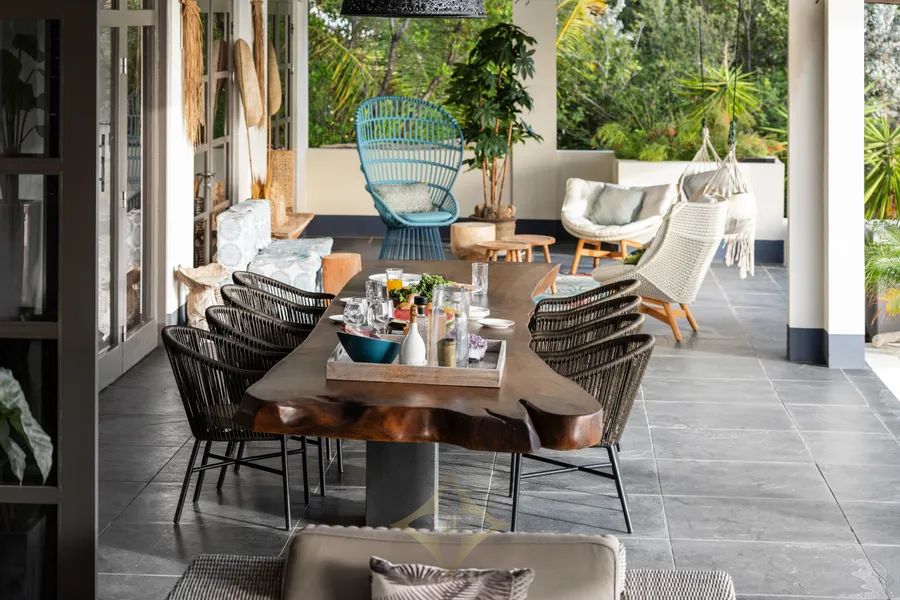 Outdoor Area: Sunbathe under palm trees by the pool Life mainly takes place outdoors due to the pleasant climate. The villa is fully equipped for this, with comfortable and even unique amenities, continuing the split-level trend. At the back of the villa, an open terrace spans the entire width. This consists of three sections, with a large dining table made from a tree trunk, and six chairs as the centerpiece, extending from the living room. Behind master bedroom 1, a lounge area is set up with two large armchairs and a hammock. A second seating area is adjacent to the TV annex relaxation space inside. From the terrace, the stunning 8.8-meter pool, with an outdoor shower, takes center stage. Step down to the pool deck, surrounded by a fence, and bask in the sun! Sun loungers under tropical palm trees are ready for you. The view of Spanish Water and the Tafelberg is breathtaking.