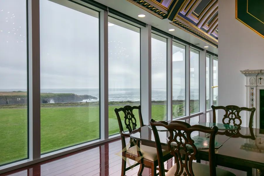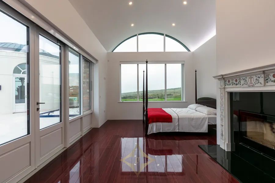 The classical design of ornately decorative ceiling cornices replete with gold gilding, a well-executed cantilever stone staircase with elegantly brass coated balustrades and the incorporation of original and exquisite Bossi chimneypieces blended with clean contemporary architectural design to present a truly unique and interesting home. The effect of such design fusion and the incredible rustic West of Ireland position is intoxicating and increasingly compelling with familiarity.