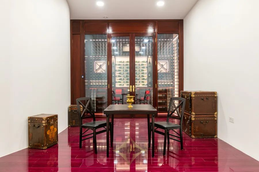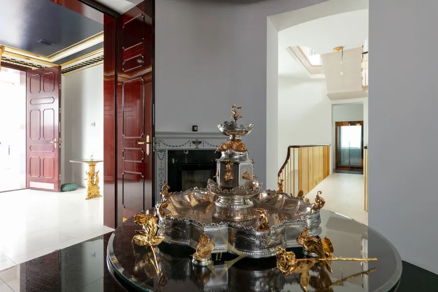The courtyard can be accessed directly from the house, the south patio terrace or the parking courtyard. It includes a delightful curve-fronted garden room, a lily pond and rose beds. The integral garaging can accommodate up to four cars and link to a fuel store and into the axial hall linking to the stair hall, elevator lift and kitchen. An adjacent room to the kitchen serves as a laundry and back kitchen.