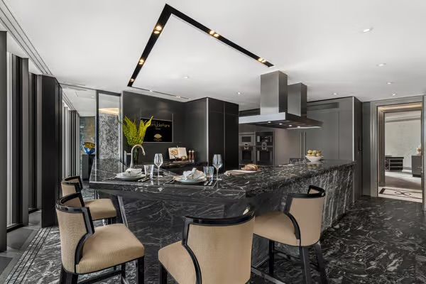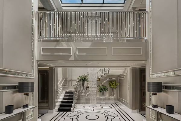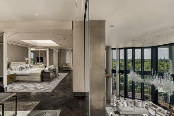 This five-bedroom penthouse located in the prestigious One Hyde Park residential development boasts 18,000 square feet and unfolds over the tenth and eleventh floors. The penthouse is one of the finest residential real estate assets in London, offering unparalleled lateral living space, in a super prime location in Knightsbridge, with uninterrupted views over Hyde Park. The home also features wrap-around terraces. One Hyde Park is one of the most exclusive and secure residential developments in the world.