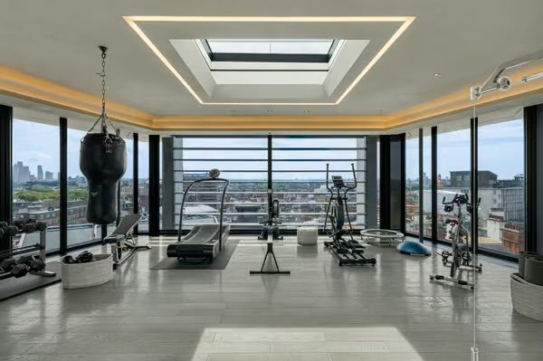 The double-height formal reception with 8-metre ceiling height serves as the main entertaining space, adorned with a magnificent glass fireplace and offering uninterrupted views and an abundance of natural light. The home has five en-suite bedrooms, each with unique marble bathrooms and generous fitted wardrobes. The principal suite, spans 2,300 square feet and overlooking Hyde Park, features twin bathrooms with Jacuzzi-style jet pools and expansive dressing rooms. Additional highlights include a cocktail bar, pool table, home cinema, two studies and meeting areas. There is a private spa with amenities including a treatment room, sauna and steam room. A dedicated gym
